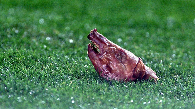 Algún tiempo después, Figo —o Frigo, como decía don Manué Ruiz de Lopera— volvió al Camp Nou y recibió una lluvia sonora de rabia y frustración culé. El acomplejado tiende a no entender que un profesional decida dar un paso adelante en su carrera y fiche por un club más grande. Esto es lo que le ocurrió al aficionado azulgrana. Miles de personas decidieron pagar para apelotonarse en un recinto deportivo y enfadarse mucho. Muy útil e inteligente no parece. Algún seguidor blaugrana gritó tanto, que se le cayó la cabeza al campo junto a Figo cuando el diez blanco se disponía a sacar un córner. Para evitar problemas con la justicia, se dijo que fue un cochinillo, pero en realidad la cabeza era de un señor con reloj de Hospitalet de Llobregat, si bien es cierto que era un poco gorrino. También llovieron cubatas por fascículos; una botella de JB por aquí, una lata de Coca-Cola por allá y el seny blaugrana congelado en cubitos de gritos de hielo. Todo en consonancia con una afición tan señorial y educada como la culé.