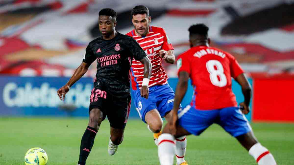 La progresión de la calidad defensiva del Granada está dando pasitos cada jornada y hay estadísticas que lo corroboran. Ha recibido 16 tantos en toda la Liga (10º en el ranking), que no es una cifra alta para el lugar que ocupa en la tabla, el 17º. Su portero Maximiano es de los arqueros que más paradas realizan del campeonato y el cuadro andaluz figura en el top 5 de equipos que más remates necesitan para encajar un gol. Después de probar con varias parejas de centrales, se está asentando la formada por Víctor Díaz y Germán a la espera de la vuelta de Duarte. En los laterales, Neva es un jugador firme atrás y Quini, que en sus inicios era un extremo, ha aprendido buenos conceptos defensivos. Sin embargo, de los cuatro sigue siendo el eslabón débil y el punto a explotar por Vinícius. El Granada en casa se hace más fuerte atrás y en cinco encuentros ha encajado siete goles. La labor de los medios, con Gonalons a la cabeza, imprime fuerza, intensidad, ayudas y coberturas a sus compañeros zagueros. Por arriba, Germán es un central que va bien en las jugadas aéreas, pero Víctor Díaz no tiene tanta destreza en este aspecto. Si a eso sumamos la estatura de Quini, nos encontramos con un equipo al que se le puede hacer daño con centros al perfil derecho entre lateral y central.