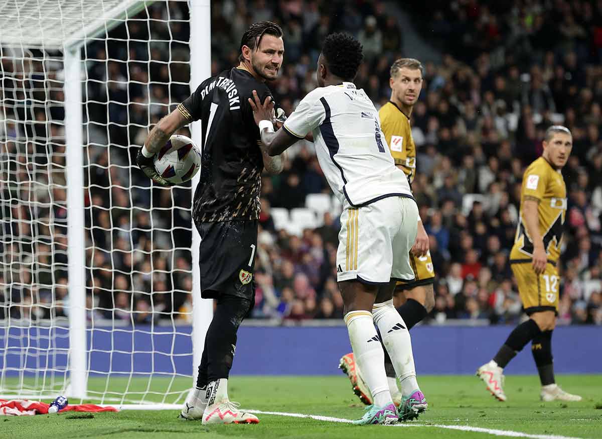 Stole Dimitrievski es el portero del Rayo Vallecano. Tiene 29 años y es de Macedonia. Ayer fue el MVP de un partido disputado en el estadio Santiago Bernabéu a las 9 de la noche de un domingo de noviembre frío, muy frío y ventoso, que no invitaba mucho a jugar al fútbol. Podría terminar mi texto aquí. Eso fue todo literal, como dicen los chavales ahora. Dimitrievski, que parecía un tipo normal e incluso simpático cuando lo entrevistaron Jesús Bengoechea y Athos Dumas aquí en La Galerna, hace un par de años, aportó, además de sus paradas, un indigno espectáculo en la segunda parte, simulando agresiones de Vinicius y enzarzándose con él en la enésima disputa barriobajera que sólo sirve para que los rivales del Madrid pierdan innoblemente el tiempo. Cuando el árbitro pitó el final, Dimitrievski lo celebró como si los proletarios del mundo hubieran alcanzado por fin la utopía socialista universal. Una liga como la de Tebas no puede tener otro tipo de héroes.