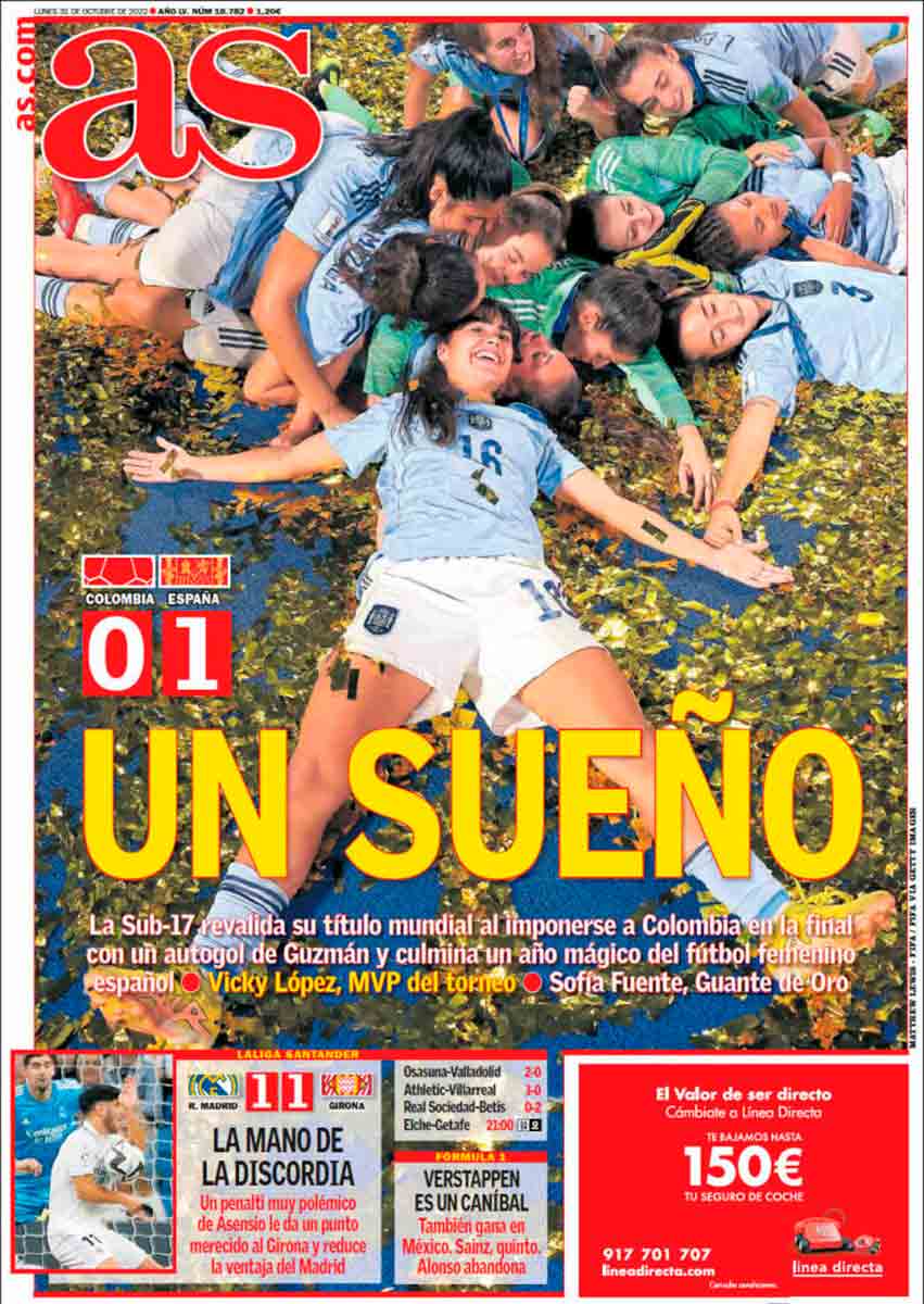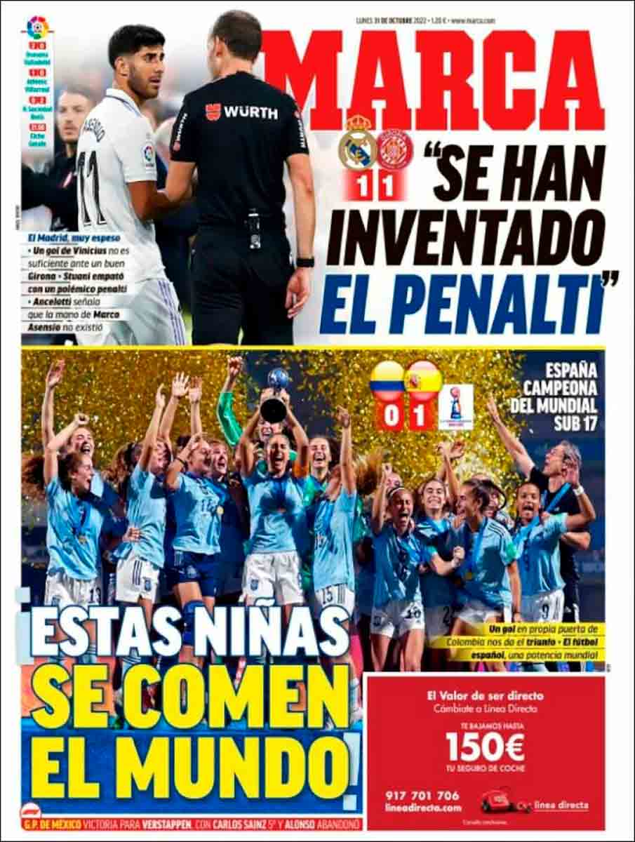 Hay que felicitar a la selección sub-17 de fútbol femenino, que salomónicamente comparte honores de portada con la controversia del Bernabéu en los diarios deportivos de hoy. Y a continuación hay que preguntarse hasta cuál de sus célebres canas (las tenía ya a los 30) está Ancelotti del factor arbitral para quejarse tan amarga y frontalmente como refleja Marca. Para ser sinceros, en una segunda toma lateral a este portanalista la mano de Asensio le parece eso, mano y por tanto penalti. No es la mano derecha sino la izquierda, que se activa de manera instintiva, para protegerse, y desvía la trayectoria del balón. Pero existen tantas normas y circulares al respecto, a cual más abstrusa y peor redactada, que ya nadie sabe a qué atenerse. Atención a lo que decía sobre esto John Falstaff, abogado de profesión, ayer, tras el escándalo, en el chat de La Galerna.