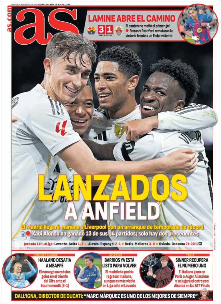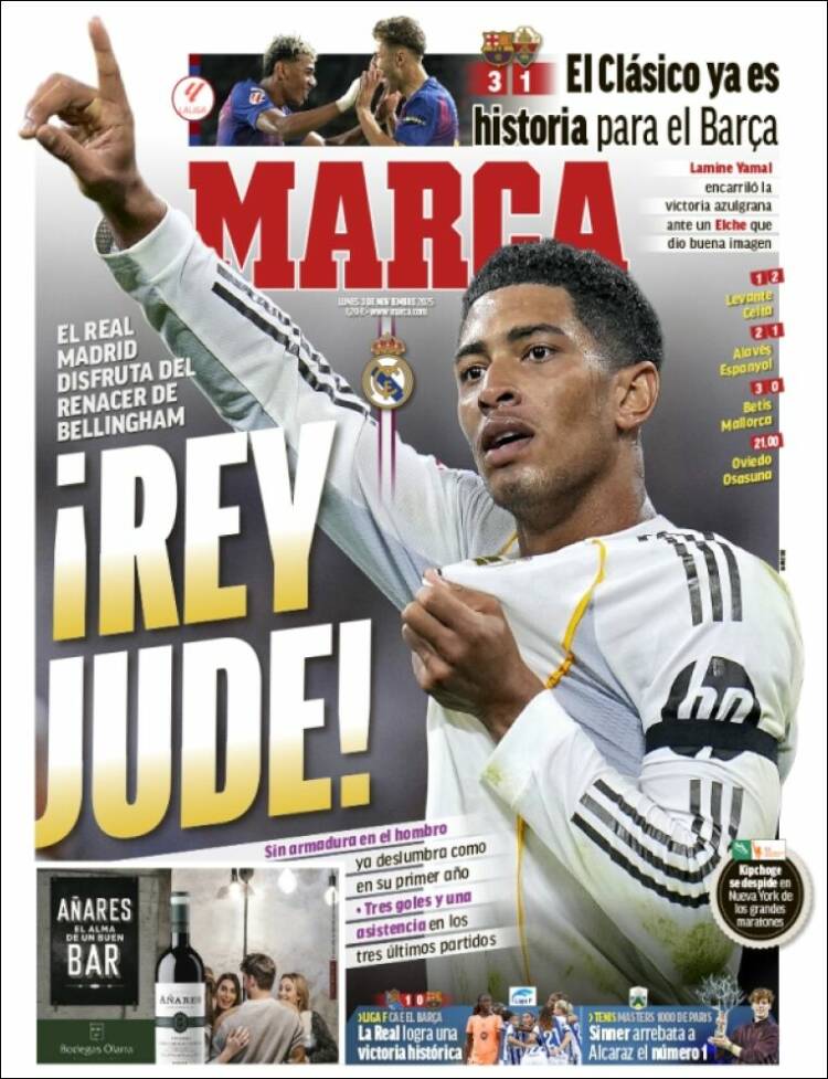 Marca personaliza en Jude Bellingham la pujanza del Madrid de Xabi y no nos parece mal, como tampoco nos desagrada (habremos de admitirlo) el juego de palabras (“Rey Jude” por “Hey Jude”) con el que adornan su primera plana. En la víspera del partido a orillas del Mersey, conviene sacar a relucir todo el arsenal de canciones de los Beatles que nos puedan favorecer, empezando por Hey Jude, claro, que es la más inmediata y obvia. Dice Marca que, “sin armadura en el hombro”, nos encontramos ante el resurgimiento del mejor Bellingham, y no podemos quejarnos de que el clásico de Paul McCartney no nos avisara hace seis décadas: “Hey Jude / Don’t carry the world upon your shoulders”.