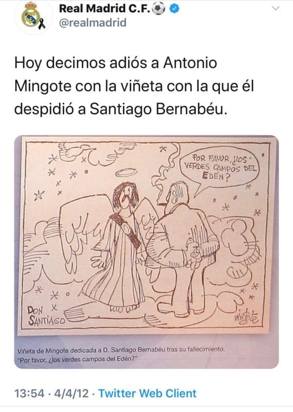 Épocas de cine en blanco y negro, de las primeras Copas de Europa, de una capital como Madrid que volvía a ponerse en el mapa europeo en gran parte gracias a su mayor emblema, el club de nuestros amores. No olvidemos que Don Antonio Mingote aconsejó al primer Gobierno de la democracia, allá por 1977, y en clave de humor, que el mejor embajador para poder España integrarse en la CEE era Don Santiago Bernabéu “que tenía una acreditada experiencia de 6 Copas de Europa logradas”. Magnífica por cierto fue la viñeta homenaje de Don Antonio a Bernabéu el día de su fallecimiento, que el Real Madrid reprodujo a su vez (en un tuit) como homenaje a Mingote el día que éste nos dejó. Siempre con humor de categoría, con clase, con sutileza. Humor blanco en definitiva, que, como es bien sabido, no tiene connotaciones ni denotaciones negativas.