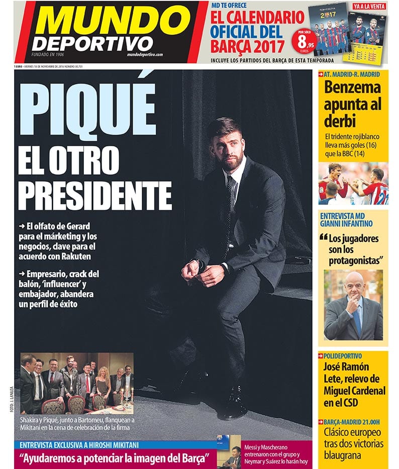 El asunto de la sobrevenida presidencia del Barça por parte de Piqué nos tiene francamente anonadados, porque una cosa es postularse para una cargo futuro y otra hacerse fotos como la que trae a su primera plana el diario de Godó, grande de España, que bajo el lema "El otro presidente" nos presenta a un Gerard en plan estadista, sentado con aire de quien se desvive por su pueblo en una esquina más bien oscura del ala oeste de la casa no precisamente blanca. Estábamos tan distraídos con lo de Trump que se nos ha pasado por alto el proceso por el cual Piqué colgó las botas, se hizo el clásico Máster en gestión de empresas deportivas, se curtió unos años como directivo y finalmente asaltó el máximo cargo del organigrama culé. Es como si nos hubiéramos perdido unas setenta y cuatro portada de Sportivo preparando el terreno durante años y, en cambio, nos hubieran ya puesto el terreno ahí, de sopetón, toma tu azada y saca del surco un presidente joven aunque sobradamente preparado. Preparado para qué, esa es otra historia muy distinta. Pero preparado al fin.