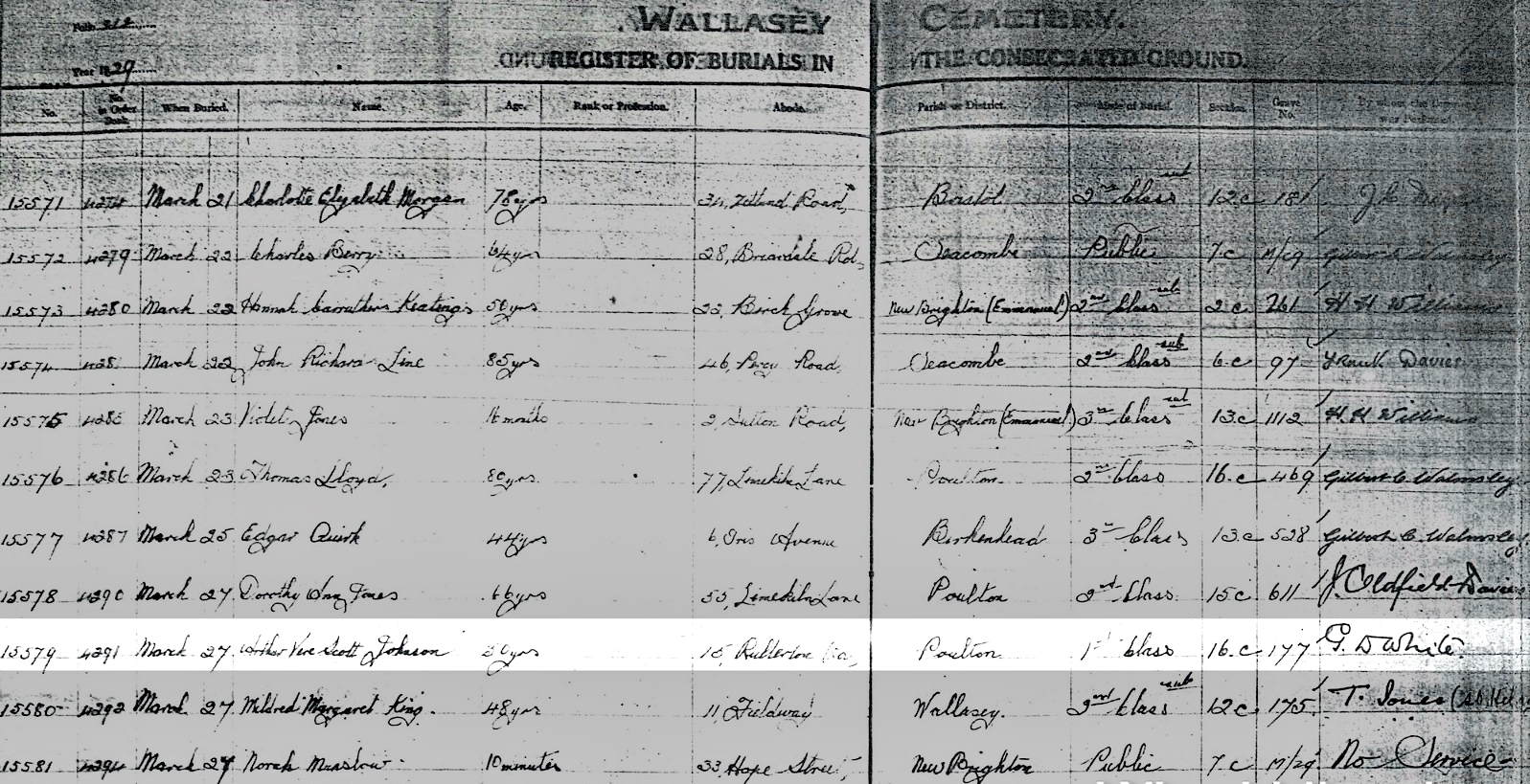 La siguiente instantánea muestra el registro del nombre de Johnson en el cementerio de Wallasey.