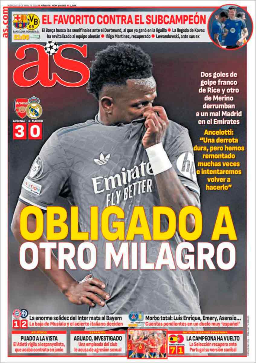 Tras el varapalo, el meneo, la lección, el sopapo futbolístico sin paliativos propinado por el Arsenal, al Madrid solo le queda la épica, como afirma Andrés Torres en su crónica del encuentro. «Obligado a otro milagro», titula As. Podéis leer aquí también las calificaciones de Genaro Desailly y la crónica arbitral de Alberto Cosín.