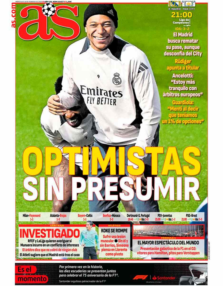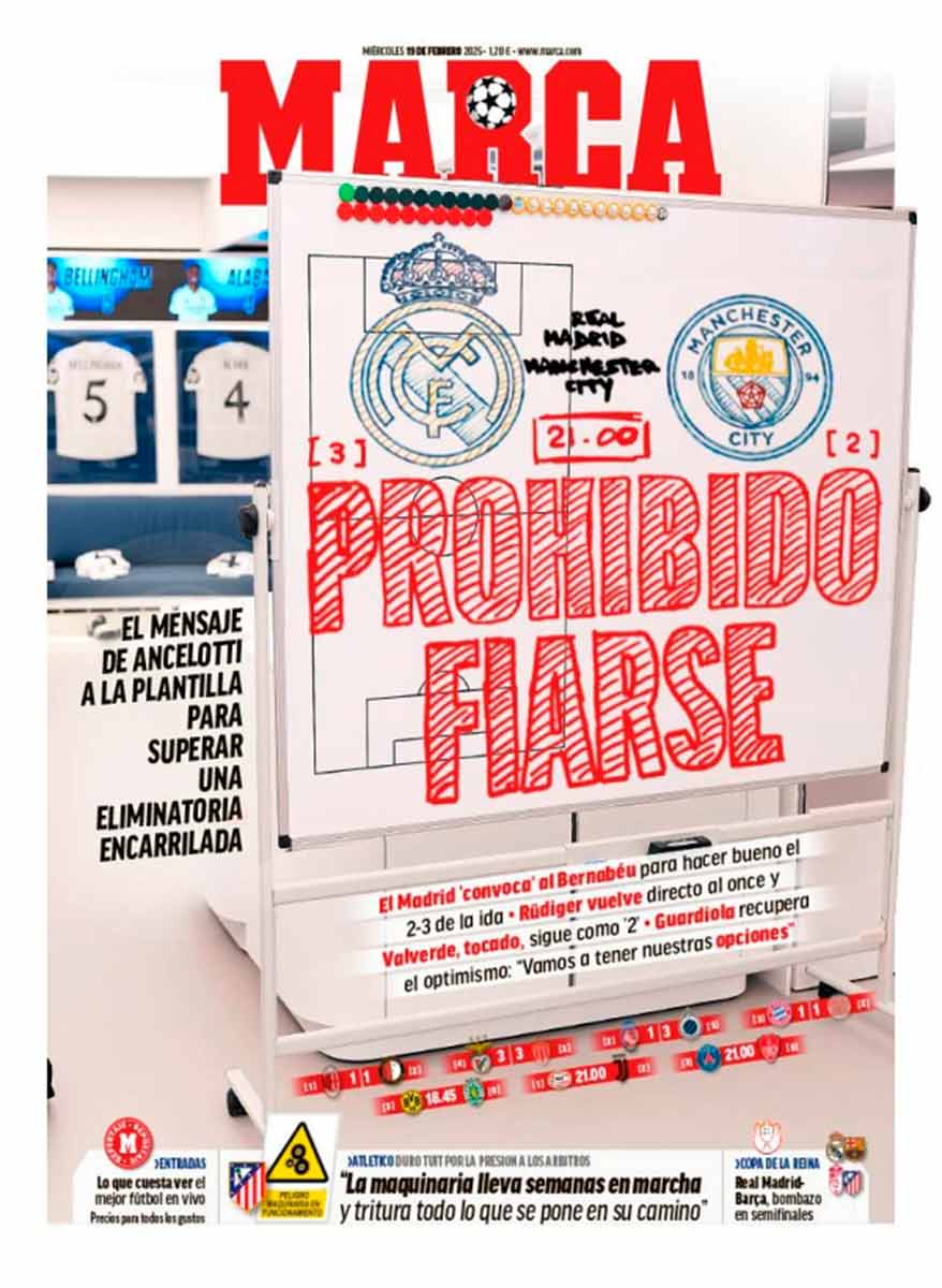 Buenos días, amigos. Hoy es día grande, hoy juega el Real Madrid en Champions y, además, contra el City, último gran antagonista europeo de los blancos. Los de Ancelotti tienen prohibido fiarse, como refleja bien Marca en su portada. Ya sabemos lo que sucede históricamente cuando se disputa la vuelta en el Bernabéu con una renta favorable.