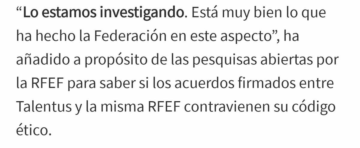 «Lo estamos investigando. Está muy bien lo que ha hecho la Federación en este aspecto», dice Tebas sobre las investigaciones abiertas por la RFEF para saber si los acuerdos alcanzados entre Talentus y la propia RFEF contravienen el código ético de la RFEF. Como dice nuestro querido Fred Gwynne, «La Real Federación está investigando a la Real Federación». Por otro lado, recordemos que la RFEF también es Tebas, porque el fútbol español es un espécimen con una estructura similar a las medusas, es decir, con un solo orificio que actúa como boca y ano.