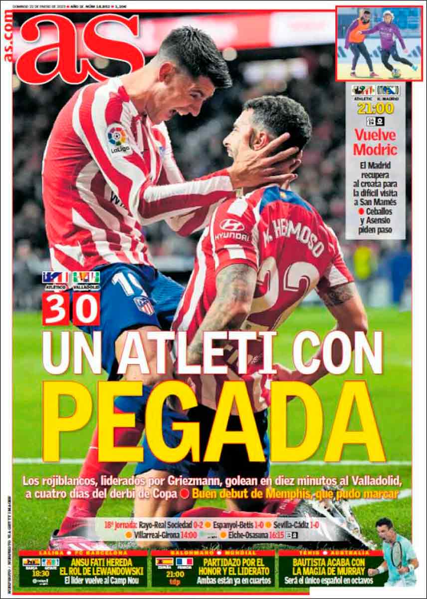 En ambos rotativos madrileños, el espacio principal es para la victoria del Atleti, que poco después de saber que se enfrentará al Madrid el jueves en Copa y antes incluso de disputarse el partido, se convirtió en un equipo solvente y ganó de manera contundente, hecho que parecía un milagro a tenor del estado de forma de los del Cholo.