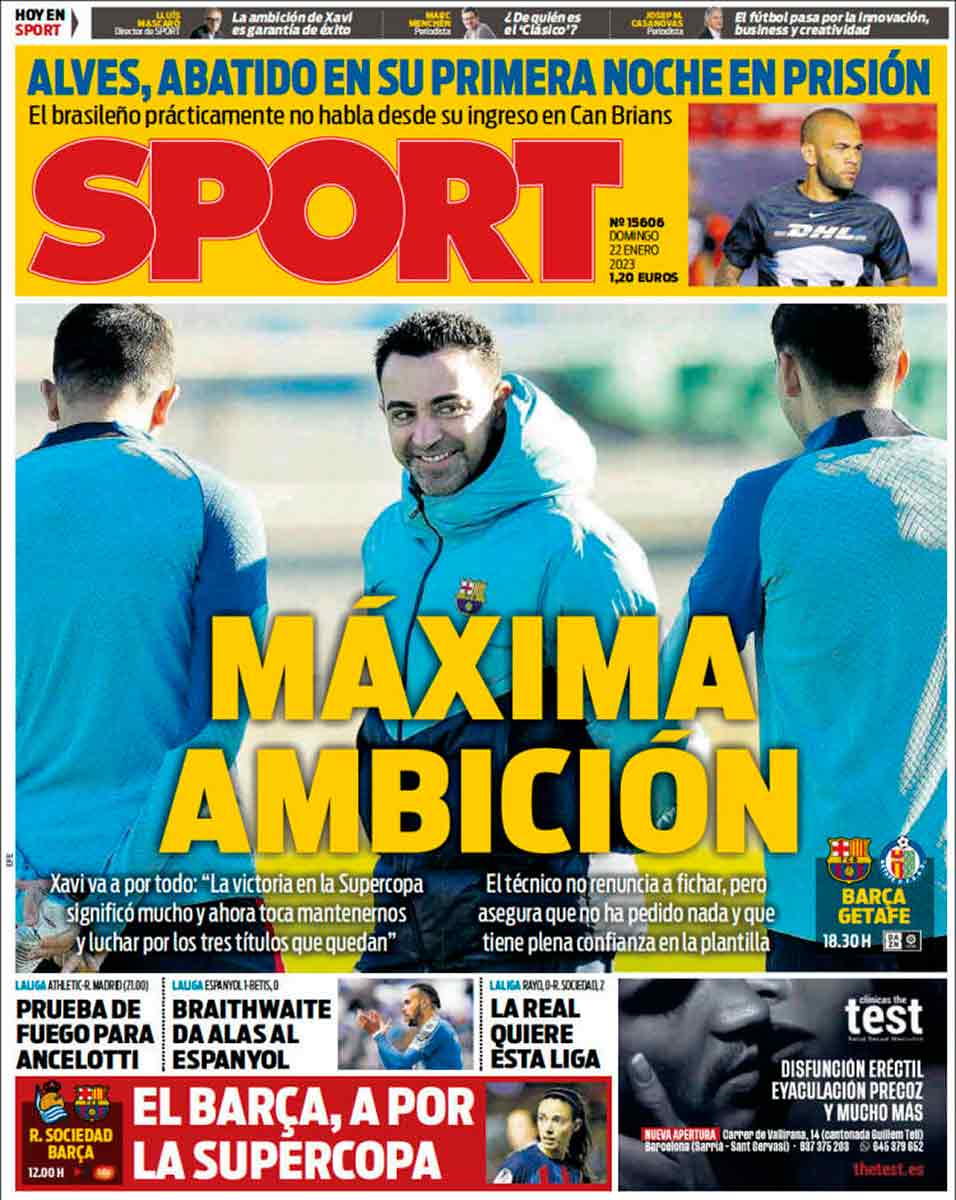 De todos modos, el asunto importante es la presunta violación perpetrada por Dani Alves. Y subrayamos que lo importante es la presunta violación, y la presunta víctima, no cómo se encuentre o se deje de encontrar Dani Alves, aunque para Sport sí es lo más destacado del caso y afirma que se encuentra abatido en su primera noche en prisión.