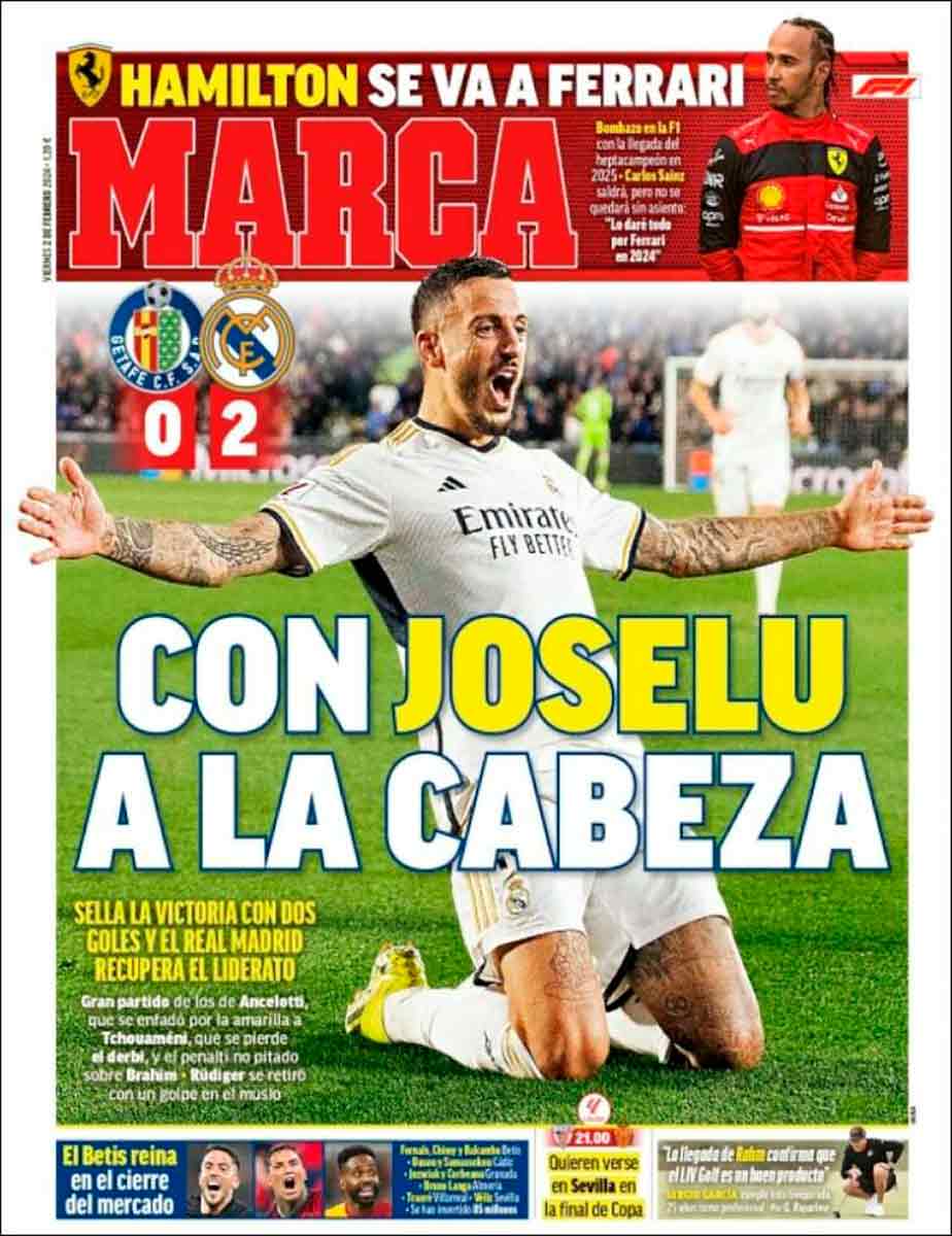 De cabeza al liderato con los pies en el suelo. La frase aplica tanto para el Madrid como para Joselu, autor de ambos goles y merecedor de la portada de Marca.