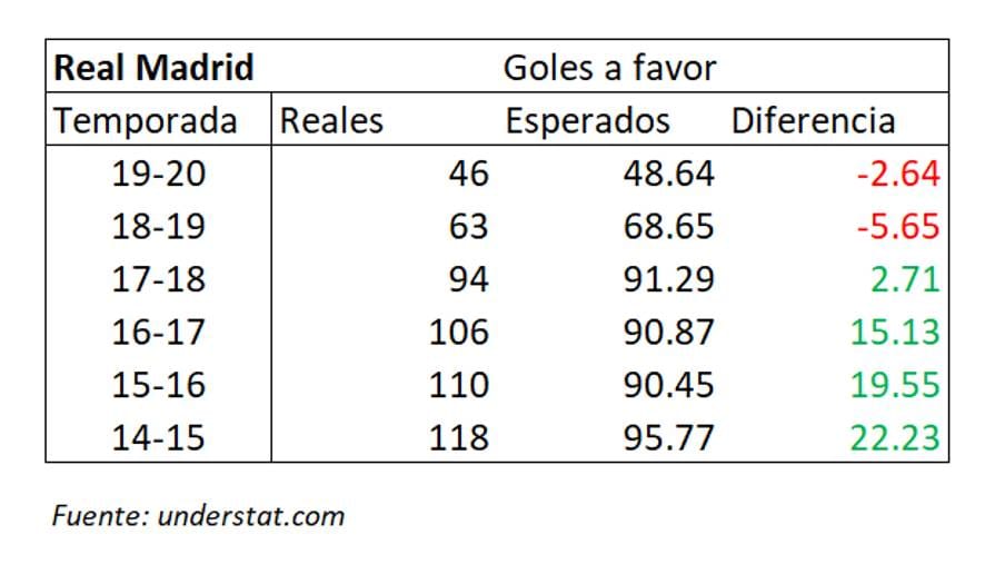 En la siguiente tabla se muestra el número de goles esperados marcados en La Liga desde la temporada 2014-2015 por el Real Madrid, según https://understat.com/, que ofrece estos datos públicamente en su web.