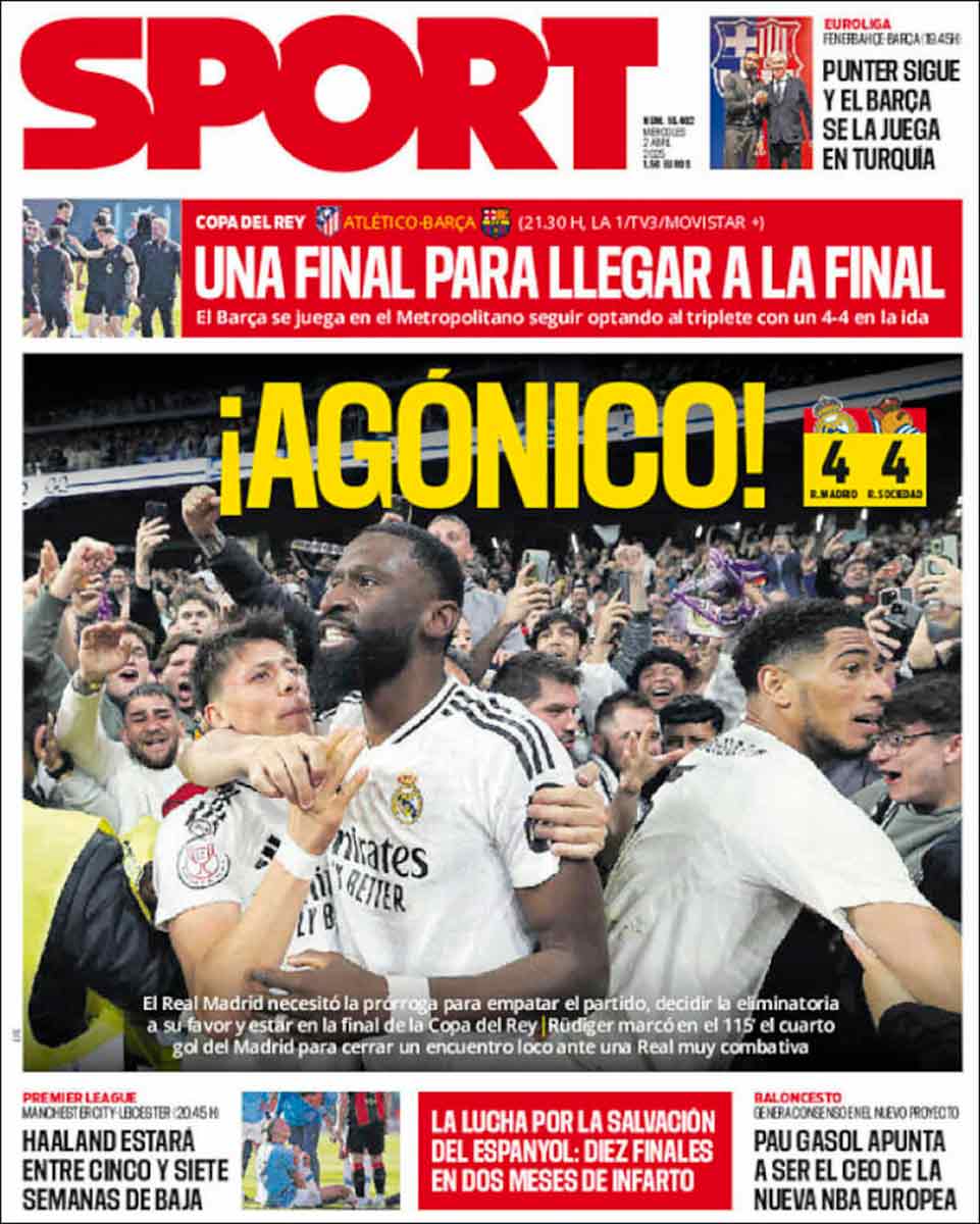 La cosa fue tan memorable que hasta Sport dedica su primera plana al loco alemán y a la victoria en la prórroga de su archienemigo. Repasamos de arriba a abajo la portada sportiva en busca de alguna queja Imanol style, para comprobar con agradable sorpresa que no, que Sport ha decidido hoy dar su portada al Madrid sin aparejar a ella ningún victimismo adicional. Qué cosas.
