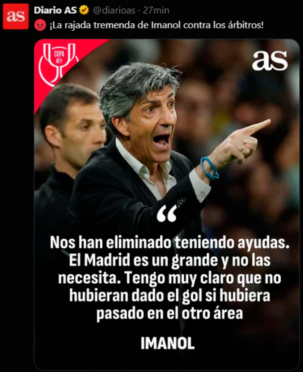 Lo de Imanol es absolutamente patético. No solo por lo que ya le conocemos, sino que ha decidido usar palabras gruesas seguramente ya meditadas por la polémica de Lunin de hace unos días y, a falta de algo de lo que quejarse, han usado la idea de un fuera de juego posicional (no lo es, lo que hizo Mbappé lo hace activamente mil equipos, incluido el Barcelona, porque si puedes ir de tu fuera de juego a tu área y con ello puede que arrastres algún otro jugador, hay mil ejemplos así) en una jugada donde si siquiera hay gol, pero da lugar al córner. Es tan patético como quejarse de un saque de banda que no era. Yo no sé cómo la afición de la Real traga tan plácidamente con un hombre cuyas intenciones son tan claras, todo el mundo sabe a quien aspira entrenar y lo que dijo de la expulsión de su jugador hace unas semanas debería haber sido suficiente para cesarle, si la Real tuviera alternativa en banquillo. Es que, como madridista, no te puedes ni cabrear con lo que dice, es una parodia, es digno de El Mundo Today. Qué circo de fútbol español.