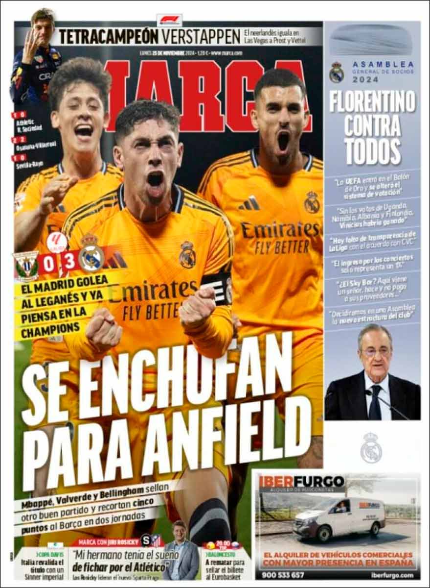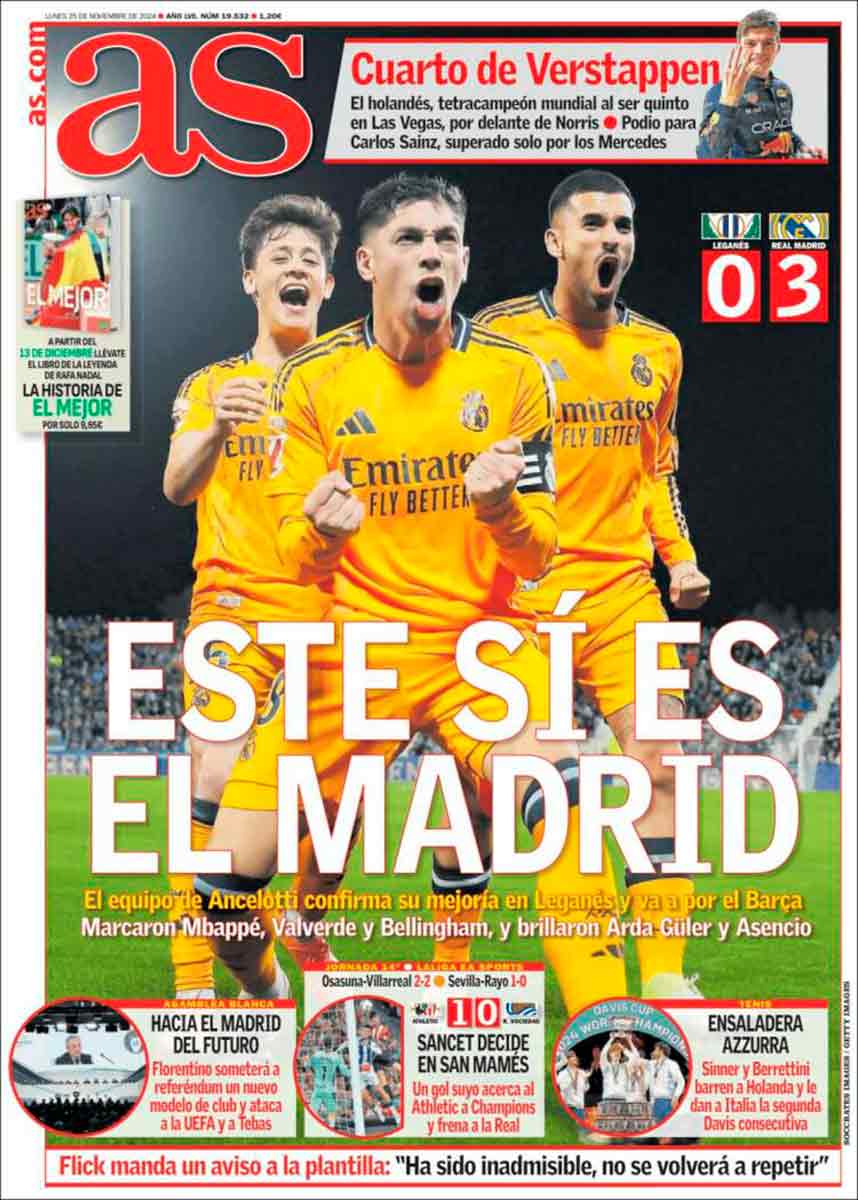 As titula: «Este sí es el Madrid». Correcto. «El equipo de Ancelotti confirma su mejora en Leganés y va a por el Barça. Marcaron Mbappé, Valverde y Bellingham, y brillaron Arda Güler y Asencio». Bien resumido, aunque brillaron más futbolistas.