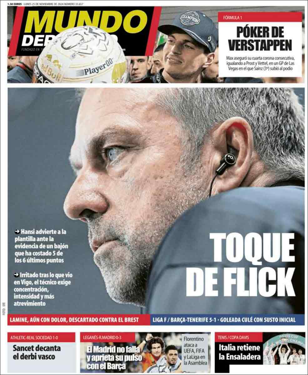 Además de duro, gracias a Mundo Deportivo sabemos que Flick está irritado. «Toque de Flick» —titula— a la plantilla por el bajón que les ha costado 5 de los últimos 6 puntos.