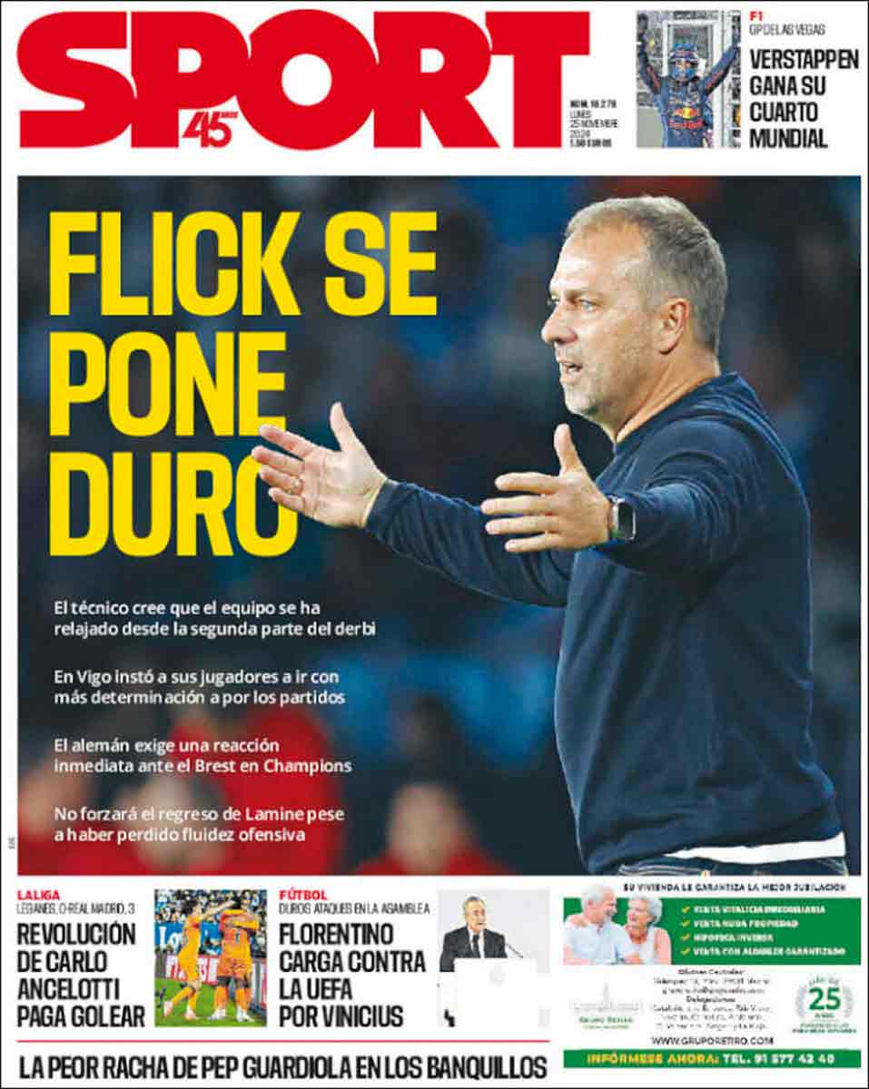 Buenos días, amigos. «La verdad es que el último 'finde' fue gracioso», así comienza Tomás Guasch su Mira, Chato de hoy —recomendadísima lectura—, y la verdad es que no podemos estar más de acuerdo. Ayer, jornada completa: Asamblea por la mañana y victoria con buen juego por la tarde. Y el sábado, pinchazo del Barça en Vigo: pese a contar varias ruedas de repuesto provistas por el CTA, se quedó parado en la cuneta al final del partido y vio como el Celta lo alcanzaba. Y claro, a Flick no le ha quedado otra que ponerse duro. Lo dice Sport.