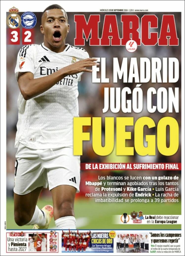 As habla de “sinfonía incompleta”, y nos parece hasta generoso. El hombre que trae a portada el diario madrileño es Mbappé, cuyo gol fue acaso el primer golazo kyliano como tal que ha facturado en la liga española. La jugada que tejió con Bellingham es un lujo al alcance de pocos, y el regate final en el área define a un extraterrestre, un monumento al fútbol sobre dos piernas. Le falta aún para ser el Mbappé que deslumbró al planeta, pues está recobrando su mejor forma tras una temporada extenuante. Pero ahí anda.