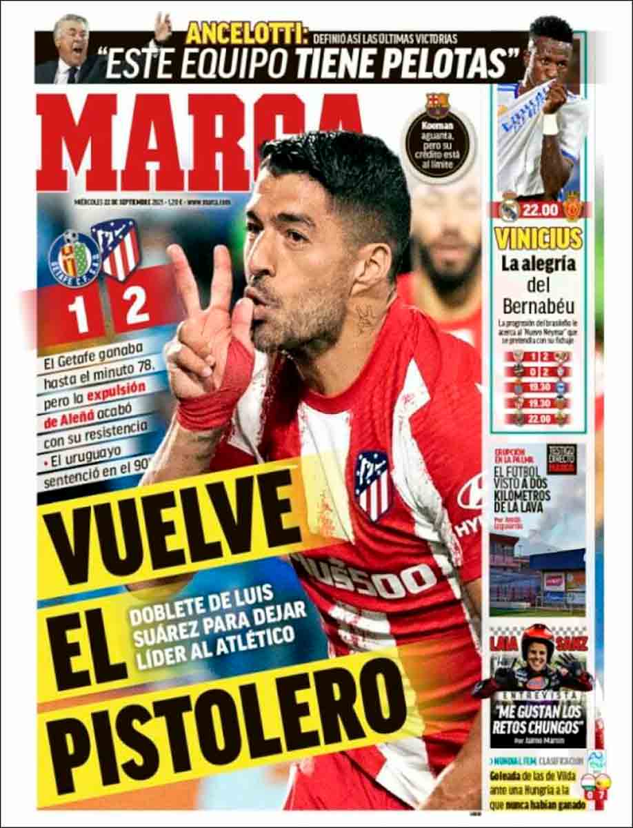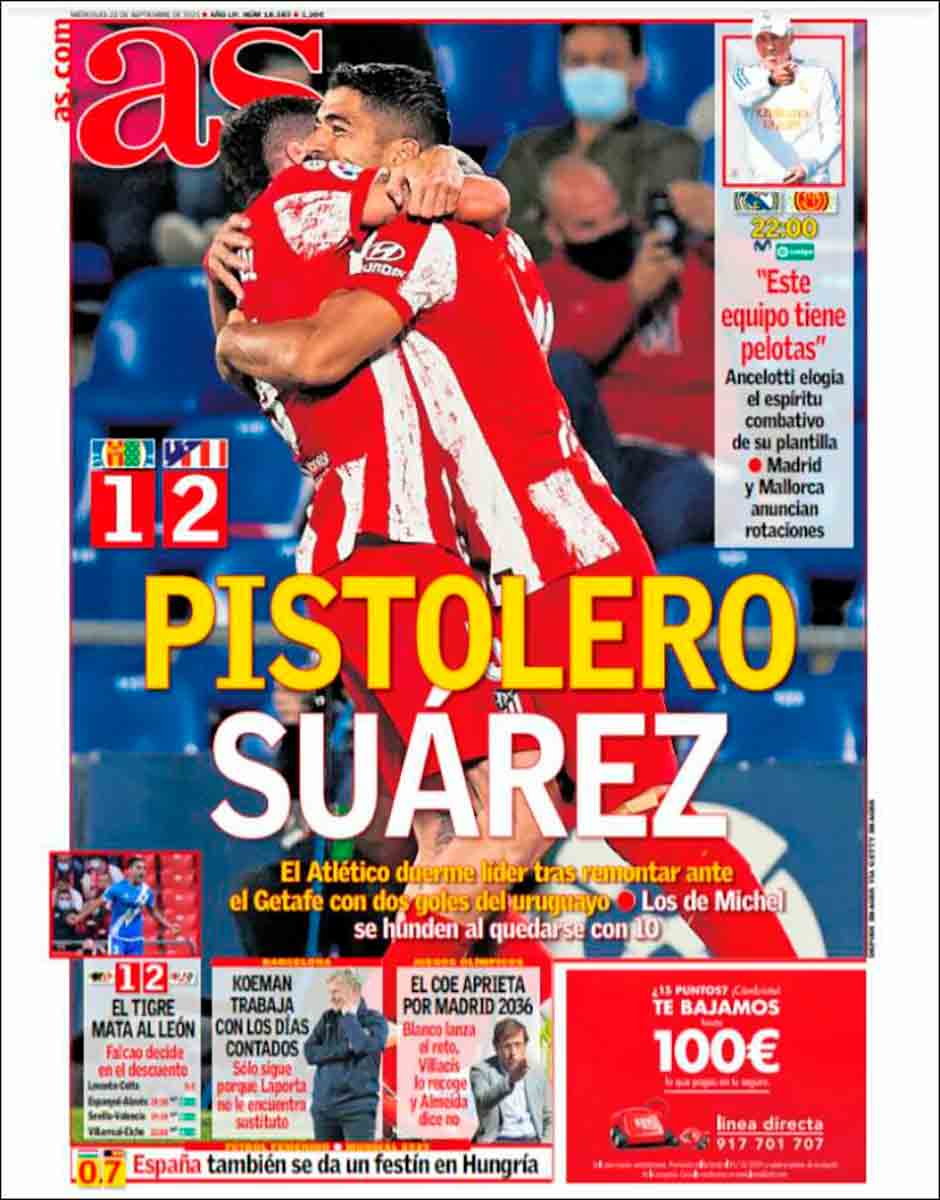 En realidad, hoy As y Marca coinciden en casi todo. Ambos minimizan las pelotas de Carletto (entiéndasenos, no hay ritos jíbaros aquí), ambos rinden pleitesía al llamado pistolero y ambos ignoran por completo el hecho de que uno de los dos goles del uruguayo al Getafe (ánimo, Míchel) fue logrado en posición dudosa, avalada aún más dudosamente por el VAR. ¿Imagináis cómo serían estas dos portadas de la prensa presuntamente afín si quien hubiera ganado merced a un gol en posición dudosa hubiera sido el Real Madrid? ¿Hay alguien en su sano juicio que niegue la certidumbre absoluta de que las palabras “gol polémico” habrían formado parte de dichas primeras planas? Es decir, “gol polémico” habría sido lo mínimo. “Victoria dudosa”. “Con ayuda del VAR”. “El Getafe se quejó de...” Elegid. No sabemos si el Atleti será el equipo del pueblo, pero sí sabemos deciros un par de gremios del pueblo de Madrid en los que hace furor el rojiblanco.