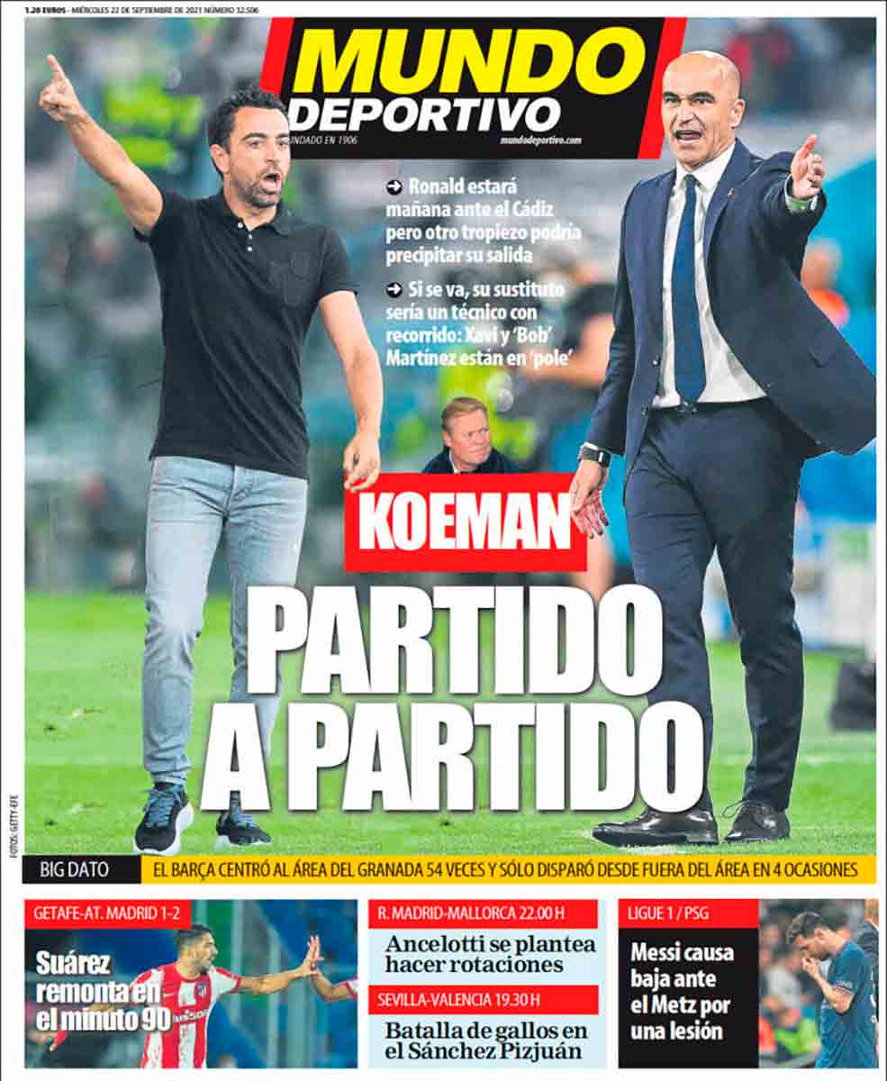 El caso es que Mundo Deportivo nos trae las figuras agigantadas de Xavi Hdez. —el jardinero de Catar — y de Bob Esponja —perdón: Martínez — junto a la (este vez sí) jibarizada anatomía de Koeman en el centro. Hay simbologías más sutiles. Para que luego digan que el tamaño no importa. Nuestra recomendación para el Jardiner y para Bob es que antes de firmar se aseguren de que el anterior inquilino del banquillo fue indemnizado por su despido, inquilino que a su vez debería haberse asegurado antes de que el inquilino anterior fue indemnizado también. Si fuera una novela de misterio, el Barça se llamaría “El extraño caso de las no-indemnizaciones dominó”.