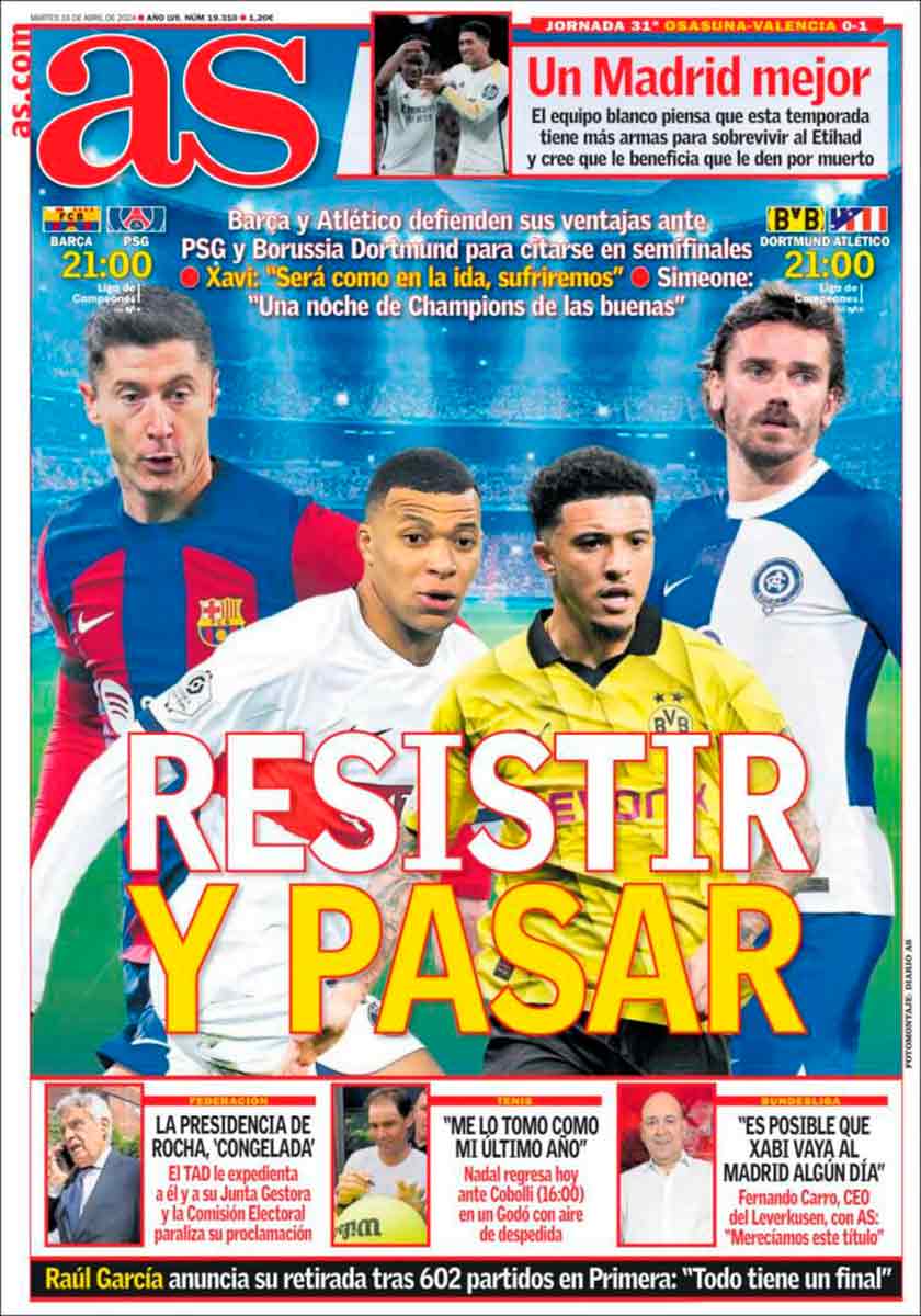 As también dedica su primera plana a Barça y Atleti, y los insta a resistir para pasar a semifinales. Ha sido fichar Ceferin a Gil Marín y tener muchas probabilidades los rojiblancos de volver a una semifinal de Champions seis años después.