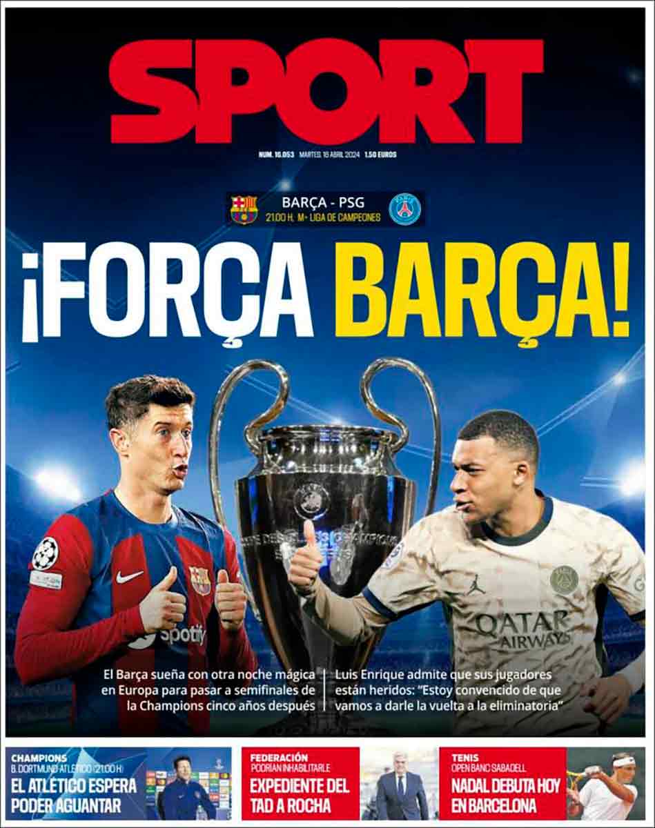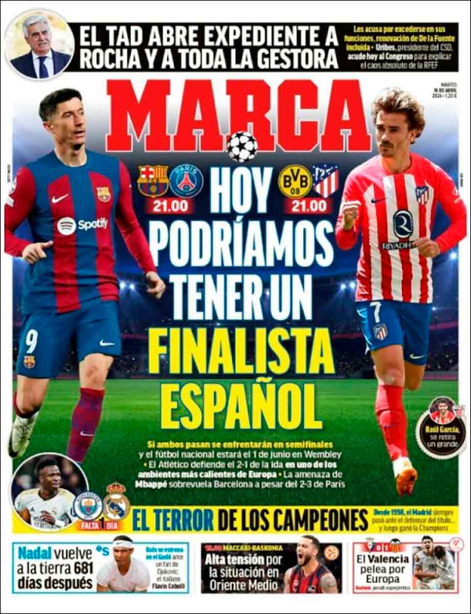 Buenos días, amigos. Marca titula «Hoy podríamos tener un finalista español», y si Barça y Atleti eliminan al PSG y Borussia Dortmund es cierto que ocurriría, pero en condiciones normales este titular no sería posible.