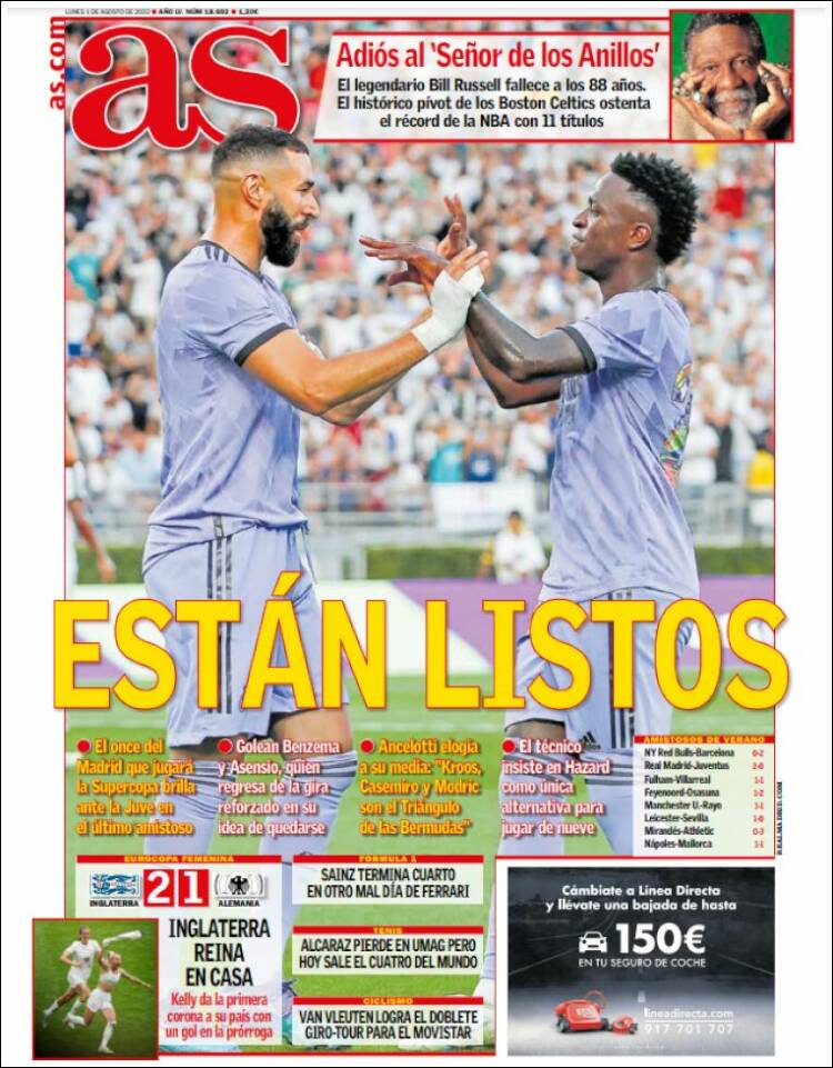 Con todo, al diario As no le duelen hoy prendas en decir algo tan profundamente incorrecto como precisamente eso, que el Madrid va bien, que llegan lanzados a la Supercopa ante el Eintracht el próximo día 10, que luego la perderán o la ganarán, pero que las sensaciones son buenas y que tanto el ambiente como la forma general del equipo son los adecuados para prolongar el estado de dicha flotante en que nos dejaron el 28 de mayo, tras el recorrido más asombroso que haya seguido club alguno en la historia de la Champions League, acompañado además por Liga y Supercopa.