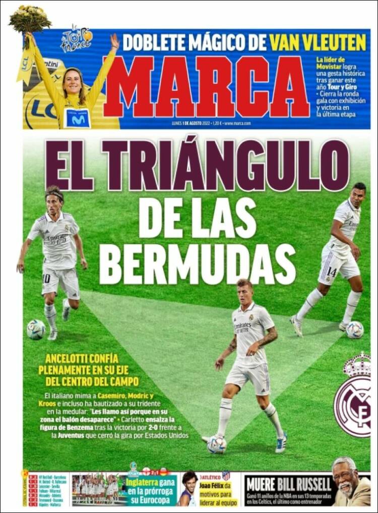 Marca le da categoría de argumento principal de portada a la ocurrencia, y nos parece bien. Lo cierto es que alguien había hablado ya no del triángulo, pero sí del rectángulo de las Bermudas para referirse al propio Bernabéu, donde tantos sucesos paranormales tuvieron lugar en la temporada pasada. Ese terreno de juego ha visto cosas de tan espeluznantes como sobrenaturales, naciones enteras rugiendo ante el simple anuncio de seis minutos de descuento, clubes estado desapareciendo bajo el oleaje, mobiliario doméstico emergiendo de las aguas como el kraken. Si el rectángulo de las Bermudas es el terreno de juego de Concha Espina, el triángulo lo conforman Casemiro, Kroos y Modric, la sacrosanta CKM que ante el Eintracht volverá a formar de inicio, y resulta difícil reprochárselo a Carletto visto su rendimiento y a pesar de que bullen a su trasluz talentos como Camavinga y Tchouméni. "Les llamo así (el triángulo de las Bermudas) porque en su zona el balón desaparece", aclara Carletto, aunque a nosotros se nos antoja que quienes desaparecen por ahí son los rivales, a quienes ya no vuelve a encontrar con vida ni la NASA.