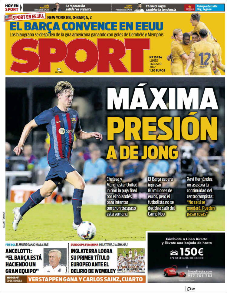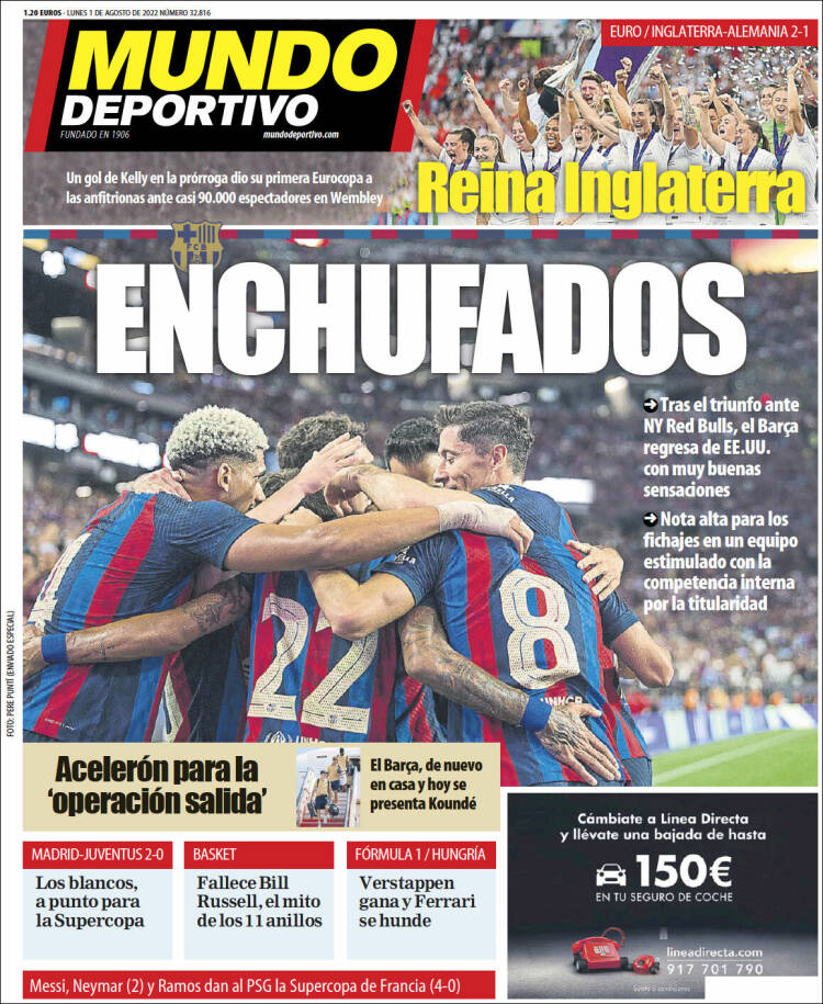 Os dejamos con las portadas cataculés, que siguen en Canaletas a cuenta de sus fichajes, propiciados por el palanqueo de Laporta. ¿Qué es el palanqueo?, dices mientras clavas tus pupilas en mi pupila azul. El palanqueo es como el perreo, pero poniendo con el culo en pompa al pobre De Jong, que cobrará el dinero que legítimamente reclama cuando se produzca el juicio de la Operación Soule.