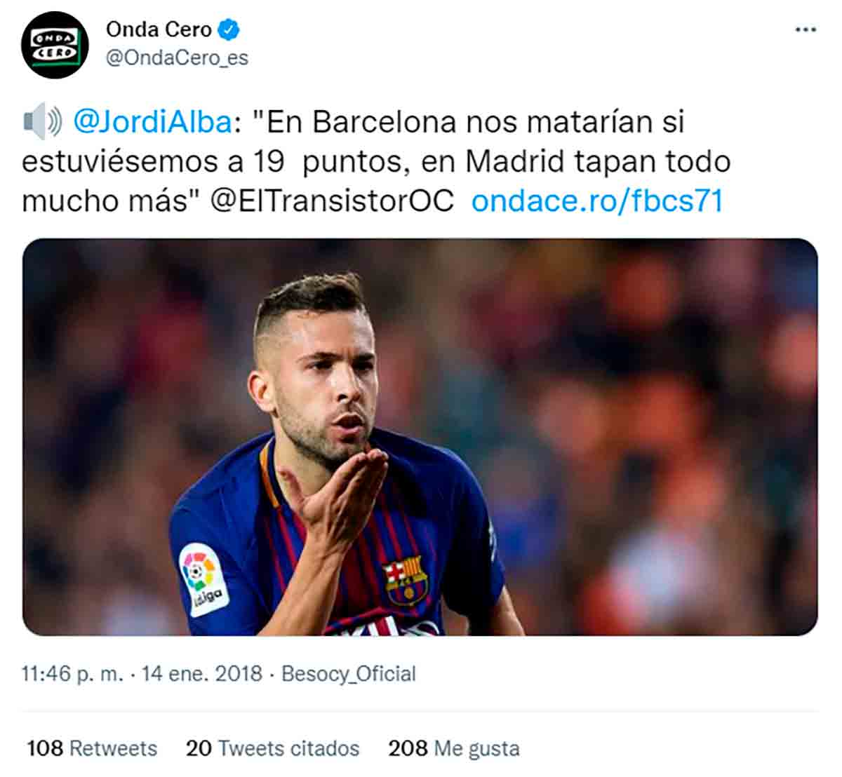 "Recordemos otro hit de este futbolista de ética tan firme como es Jordi Alba, que en 2018 dijo que si el Barcelona estuviese a 19 puntos del líder les matarían, porque en Madrid tapan todo más. Además de maleducado, mentiroso y mal compañero es un pésimo adivino y un desconocedor absoluto del fútbol, del Madrid y de la vida"