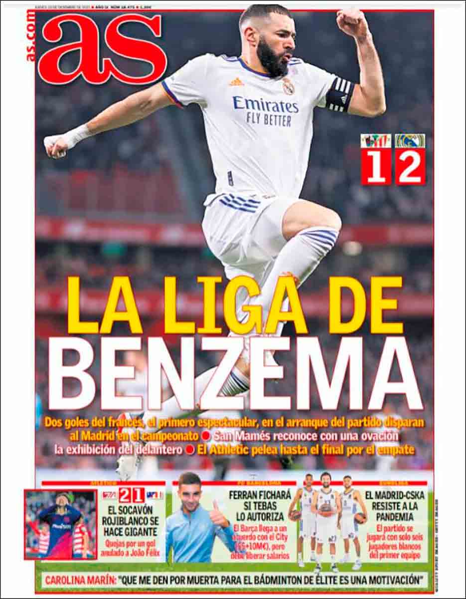 Marca titula “Antivirus” e ilustra con una fotografía de Benzema. Si Benzema es el antivirus del Madrid para sobreponerse al covid, Courtois es el Firewall, el golazo de anoche del Athletic fue el primero que recibía el Madrid en cinco jornadas.