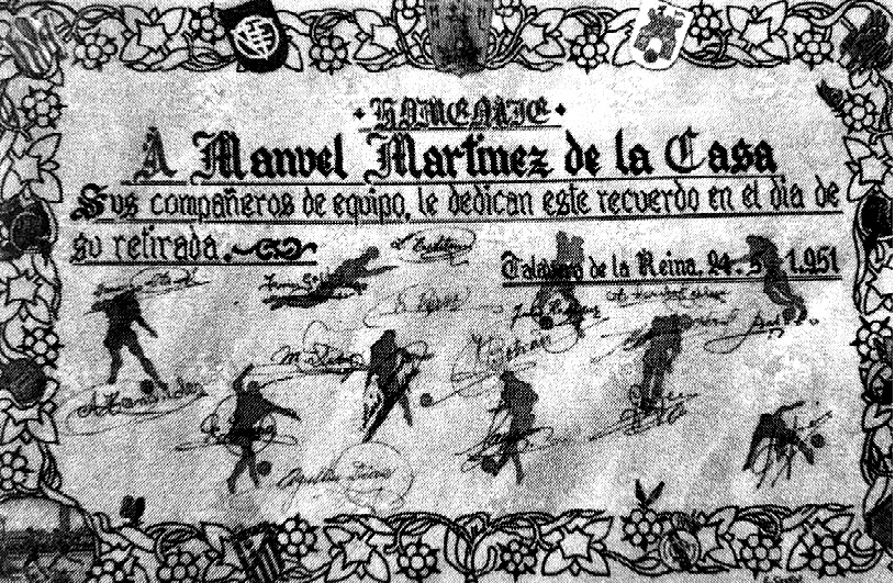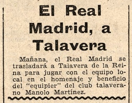 Una semana después de perder contra los donostiarras, fueron a Talavera en un encuentro ya de la post temporada. El partido quedó fijado para el 24 de mayo en un terreno de juego de El Prado, que había sido inaugurado unos años antes, en 1944, y al que se conocía también como campo de Educación y Descanso. El homenajeado Manuel Martínez de la Casa había sido una de las grandes estrellas del Talavera y decía adiós al fútbol con 28 años porque empezaba a recibir más pitos que elogios desde la grada.