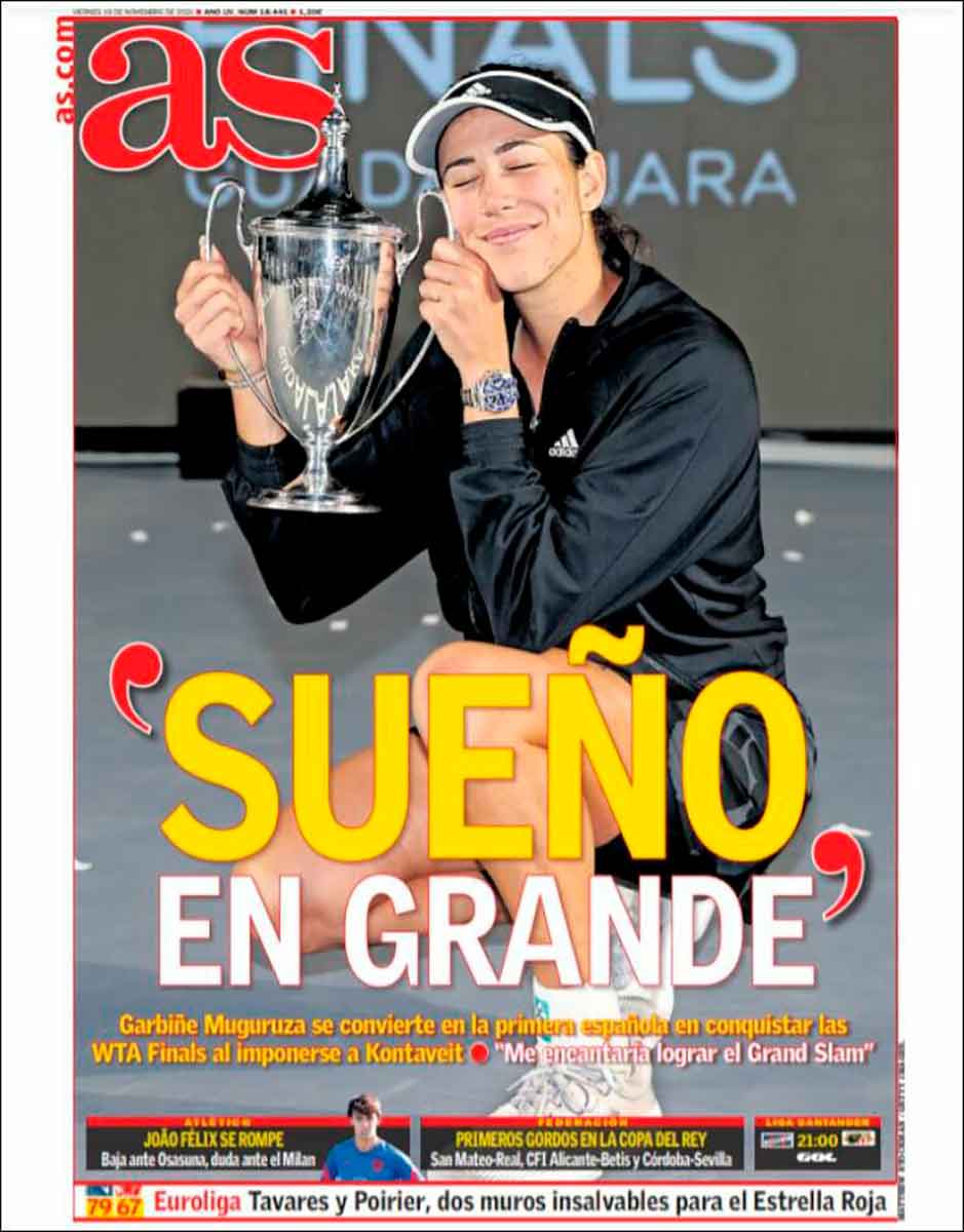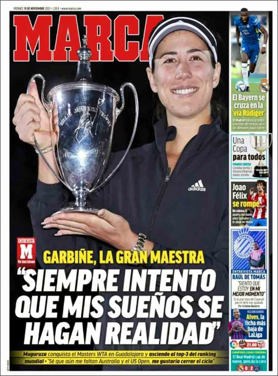 Garbiñe Muguruza es madridismo lo sepa ella o no, lo quiera ella o no. Ya sabéis que en esta página consideramos madridismo, por definición, todo aquello que nos gusta, desde Clint Eastwood a Springsteen pasando por Monica Bellucci o Paul Auster, y Garbiñe no podía ser una excepción. Garbiñe es una jugadora excepcional, además de atesorar una clase y una belleza al alcance de muy pocas. ¿Se puede decir que Garbiñe es guapa? Permitid el arrebato de incorrección madridista. Disculpad el exabrupto pasado por Concha Espina: Garbiñe es guapísima, y aparece radiante en las cuatro portadas de la prensa de hoy, iluminando nuestra mañana como el epítome de excelencia y gracia que representa y es.