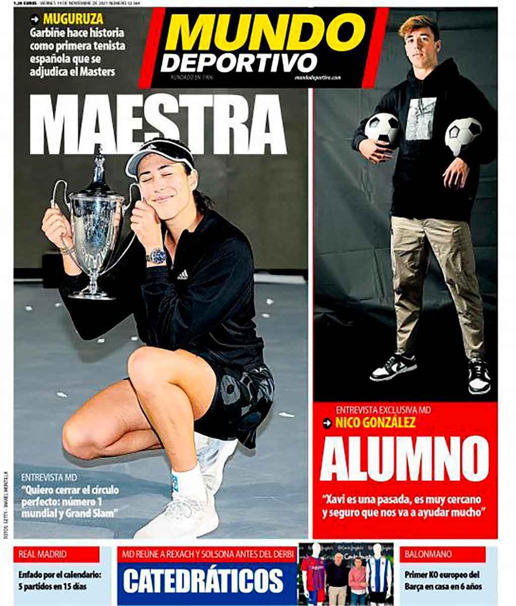 Si mezclar a Garbiñe con Xavi ya nos parecía un atentado estético sin precedentes, el colocar esta foto de la tenista junto a la de Nico, joven a quien el Señor no parece haber llamado por los caminos del glamour, faltando sólo un grafiti con motivos discutibles a su espalda, nos resulta de juzgado de guardia. Vaya la carrera de Nico por donde tenga que ir (la llamada de Luis Enrique la damos por hecha también), y camine la gloria en la pista de Muguruza por caminos no transitados por el Barça del futuro próximo, es decir, los caminos del éxito. Mezclen churras con merinas. Mezclen ruina con Sterling. Mezclen Pedri con Kubala. Mezclen fútbol y política. Pero por favor: dejen a Garbiñe en paz.