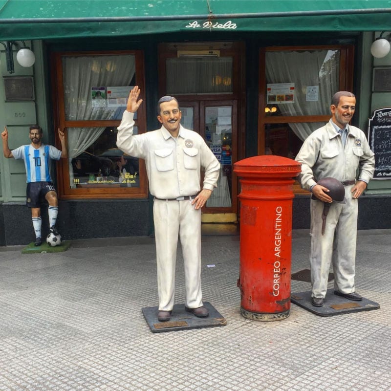 Era natural entonces que el local de la Avenida Quintana pronto se volviese el refugio predilecto donde van a parar las estatuas de cera que tienen perdida la fe. Entre sus mesas merodean a diario visitantes disfrazados con remeras del Che Guevara y chambergos gardelianos encasquetados sobre dorados dreadlocks tomándose selfies junto a la variopinta galería de ilustrísimos que se fueron acumulando en el histórico recinto. Algunos, con la pintura todavía por fraguar, incluso se diría que respiran y conspiran o se desmañan por una última conquista.