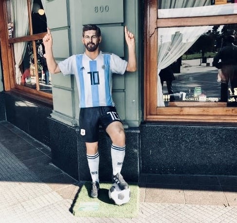 Pues el absurdo comienza a consumarse desde las inmediaciones del lugar. Apenas nos aproximamos, a ambos lados del buzón de la esquina, la silueta por duplicado del piloto Juan Galvez nos propone un desafío al astigmatismo, inquietante por demás si pensamos en términos automovilísticos. Pero junto a la puerta nos aguarda lo peor: un muñecote con la facha inconfundible de ‘el-mejor-jugador-del-mundo’, enfundado en la camiseta del seccionado argentino y los deditos en alto, cual si festejase un gol o bailase una cumbia, recibe al visitante que pasa por la vereda desprevenido, mientras se entretiene jugando a la escondida con los escritores apostados en el interior.
