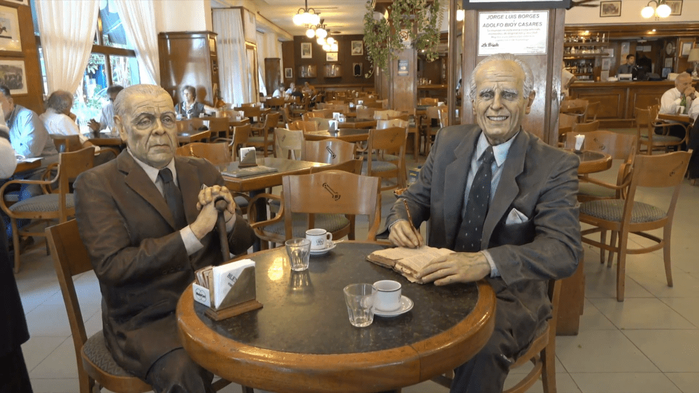 Fue gracias a esta estrambótica moda que volví a dar con ellos, plasmados en un anacrónico pintoresquismo, instalados en una mesa del bar La Biela. Georgie y Adolfito, el ‘Tío Jorge Luis y Don Adolfo, Borges y Bioy; petrificados en animada charla, las forzadas sonrisas en sus rostros agrisados como jamás pude haberlos evocado durante mi prolongada ausencia, pues cuando dejé de verlos al vivo sus facciones, marcadas por la edad claro está, conservaban una saludable lozanía. Con todo, me rechinó menos el desacierto cosmético que el lapsus histórico que vino a plantarlos en un sitio al que raramente acudían en mutua compañía puesto que, si siempre habían preferido para sus reuniones sociales el domicilio de los Bioy -más adecuado a la perpetración de sus aventuras literarias-, a la edad en que los dejaron ahí retratados las peripecias de sus respectivas existencias habían ido menguando sus encuentros.