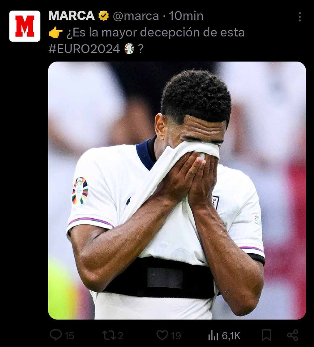 Como saben, Bellingham no había hecho nada en la Eurocopa, salvo decidir con un gol el único partido de la fase grupos ganado por los súbditos de Carlos III. También le otorgaron el MVP. Nada, menudencias.
