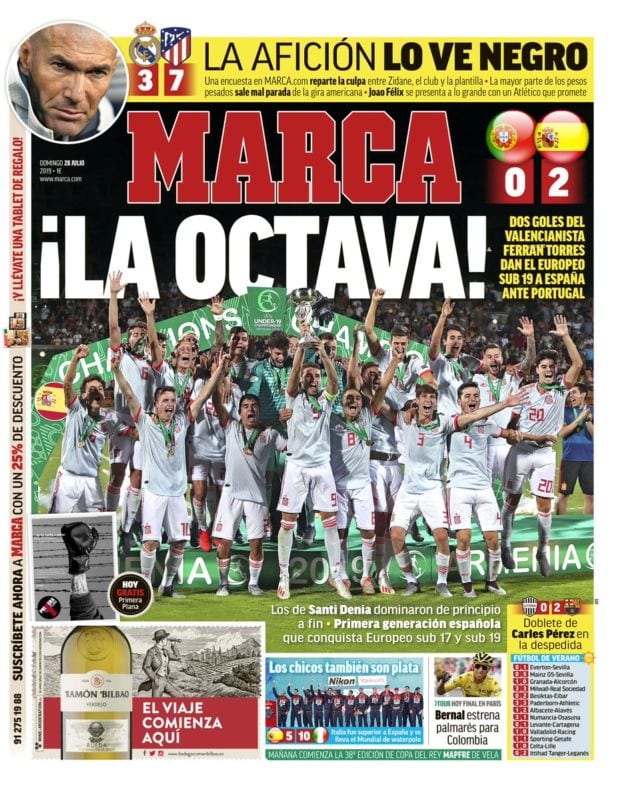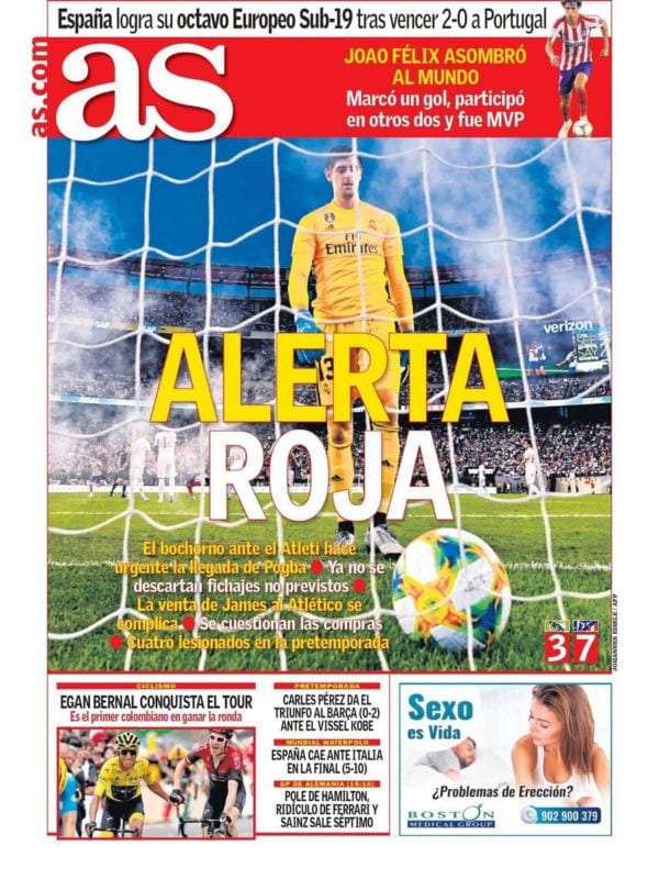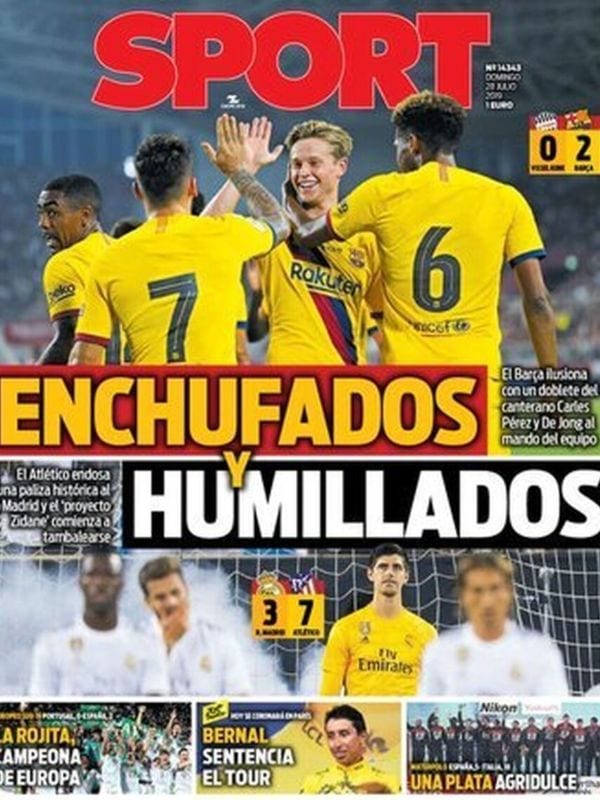Mientras tanto, la prensa culé, eternamente olvidadiza, celebra lo suyo (victoria por 0-2 al equipo chino de Iniesta) y se mofa de lo nuestro. Por supuesto no hay sintaxis, sino una ocurrencia forzada con el número 7 por parte de Mundo Deportivo y la enésima versión del cielo azulgrana y el infierno madridista por parte de Sport. Es vieja la prensa, decíamos, y el amago de solución de nuestros amics parece el de intentar rejuvenecerla a fuerza de infantilizarla, de hacerla pueril: el bien aquí, el mal allá; aquí guay, allí chof; el Barça mola, el Madrid es caca.