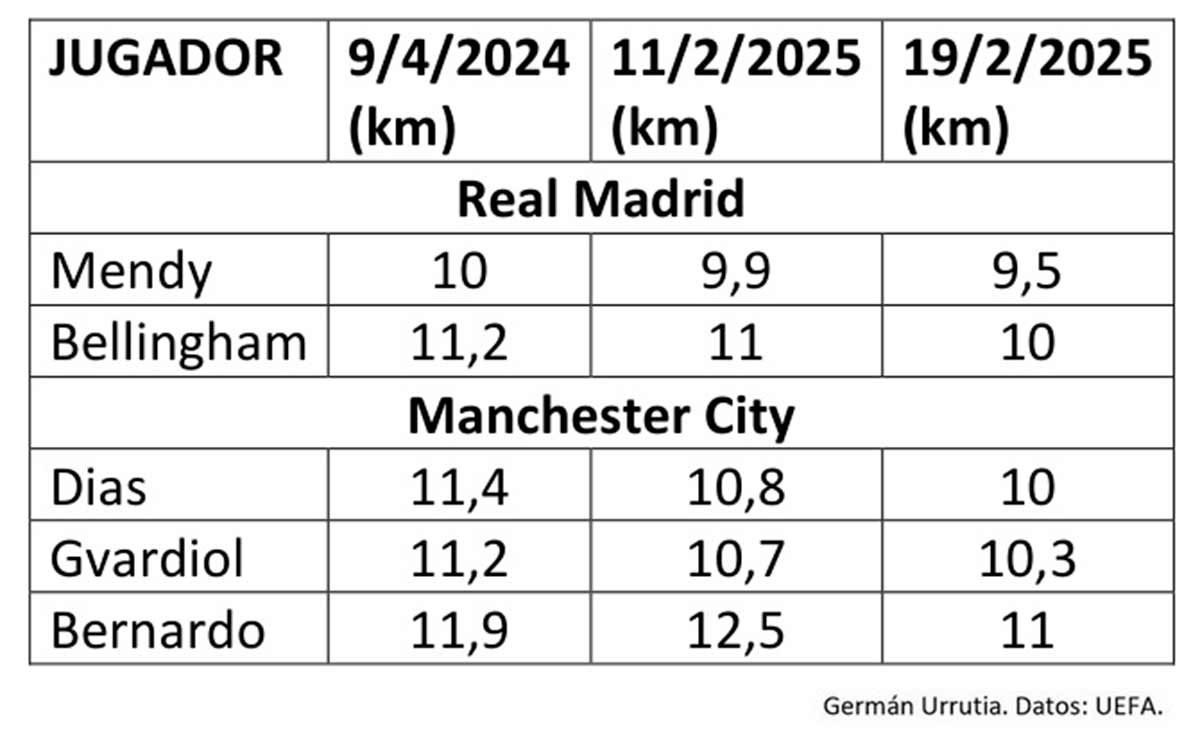 Los primeros meses de la temporada 2024/2025 no han sido fáciles para los vigentes campeones ligueros de España e Inglaterra, pero mientras el Real Madrid poco a poco es un equipo más reconocible, en Manchester van en aumento las voces que piden la salida del recién renovado Pep Guardiola tras gastarse más de 200 millones de euros en el mercado invernal. Dado que en la vuelta del pasado año fue necesaria la prórroga, el primer punto de comparación son los kilómetros recorridos en la ida (solo hubo un minuto más de añadido en el presente curso respecto al pasado). El Manchester City recorrió 115 km en 2025, 2,8 km menos que en el Bernabéu el 9 de abril de 2024. Aunque en el global de la eliminatoria fue claramente inferior, los citizen volvieron a acumular una mayor distancia completada. Ese día, el Real Madrid alcanzó los 112,8 km, por los 109 km que empleó para ganar a domicilio la semana pasada. En la noche que sirvió como bautismo europeo de Kylian Mbappé en Concha Espina, los de Ancelotti cubrieron 105 km, tres menos que los de Guardiola y Lillo.