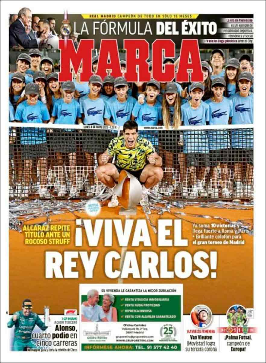 Marca se felicita por el triunfo de Alcaraz al que antes aludíamos (le felicitamos nosotros también, porque es de ley y por su madridismo), al tiempo que dedica su espacio superior a elogiar el Madrid de Florentino como un ejemplo de “rentabilidad deportiva, económica y social.” No podemos estar más de acuerdo, pero entonces ¿por qué se trata diariamente al club como si fuese un desastre?
