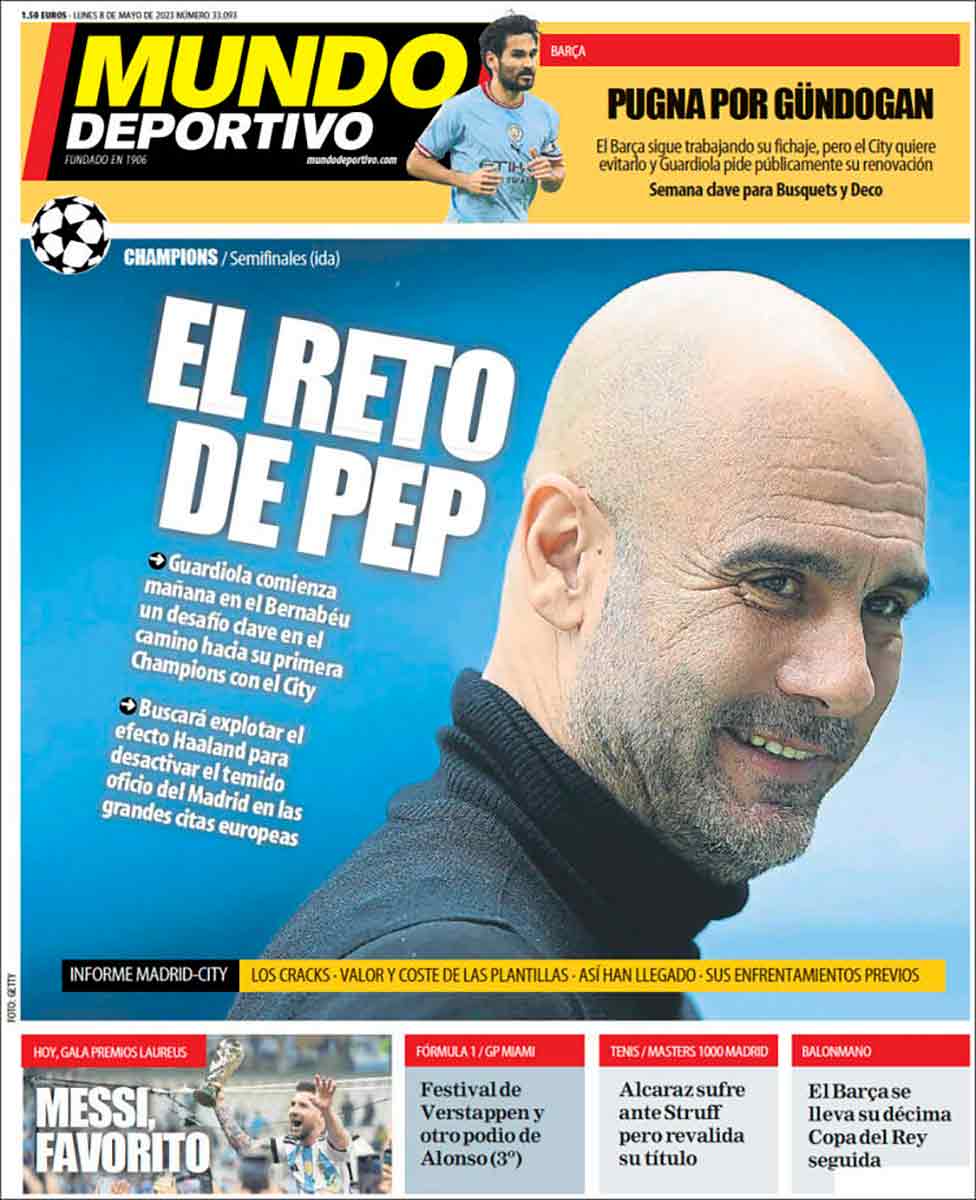 Sí, amigos. Mundo Deportivo es el único de los cuatro que va con todo con la gran cita de Champions de mañana, y que lo hace tomando partido no por el equipo español en liza, lo cual quedaría peligrosamente cerca del fascismo, sino por el Manchester City de su idolatrado Guardiola, cuya calva reluciente copa el Mundo Deportivo de hoy en instantánea que no hace justicia al de Sampedor, quien normalmente es mejor parecido que Crispín Klánder.