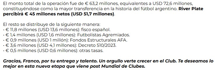 Otra duda que nos surge: ¿es el Real Madrid el único equipo del mundo que paga impuestos y tasas por los fichajes? Observad el detalle: “el Real Madrid paga 63 millones”, “El Barça abona la cláusula de 25 millones”. Los 63 millones del Real Madrid fueron detallados perfectamente por el River Plate en su web: