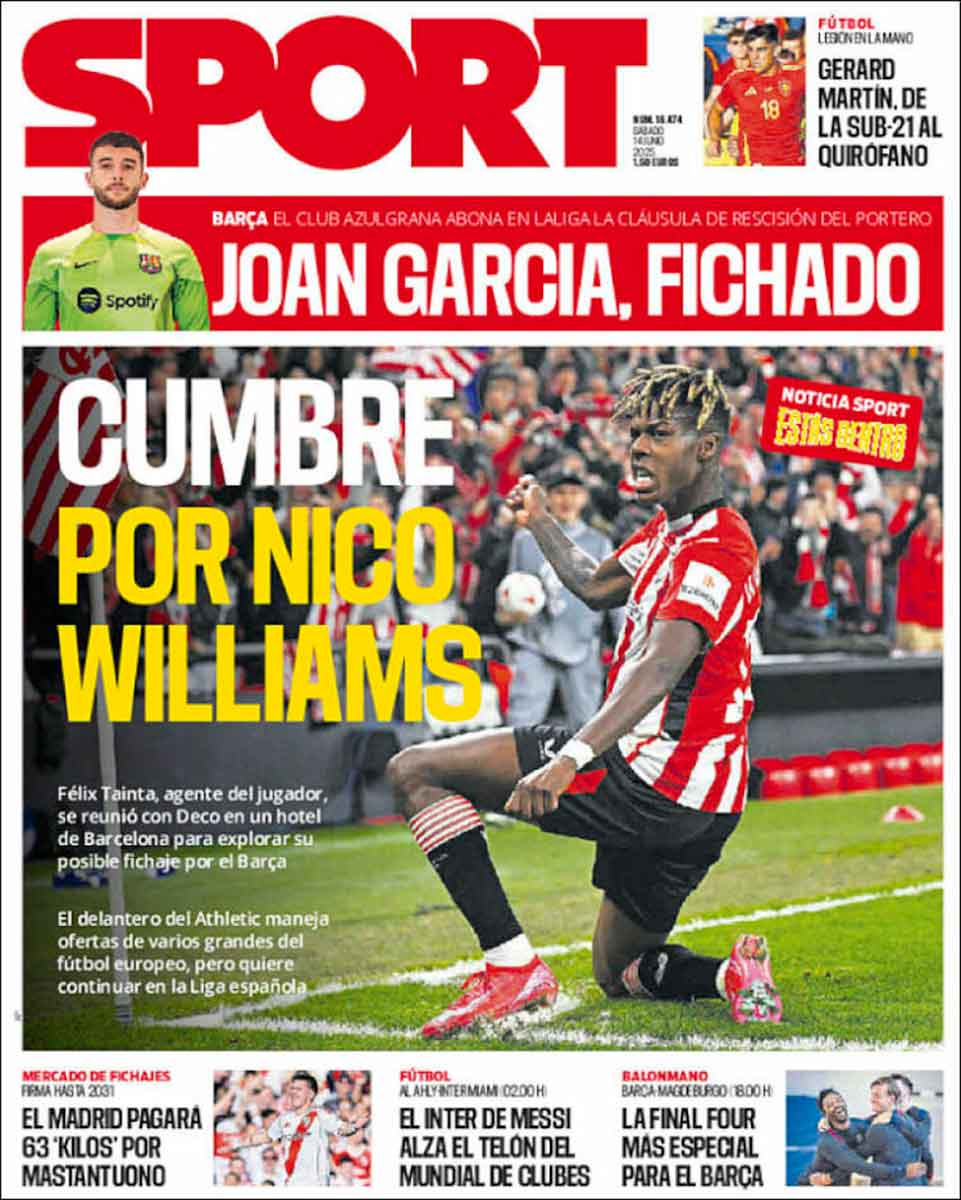 Más de lo mismo en Sport, qué horror. Y “Joan García, fichado”, ¿lo ven? Así les queda otra portada: “¡Joan García, inscrito!”. Junto a otra que ponga: “Ter Stegen perdona los 42 millones de salario que le quedan por cobrar en el club”.