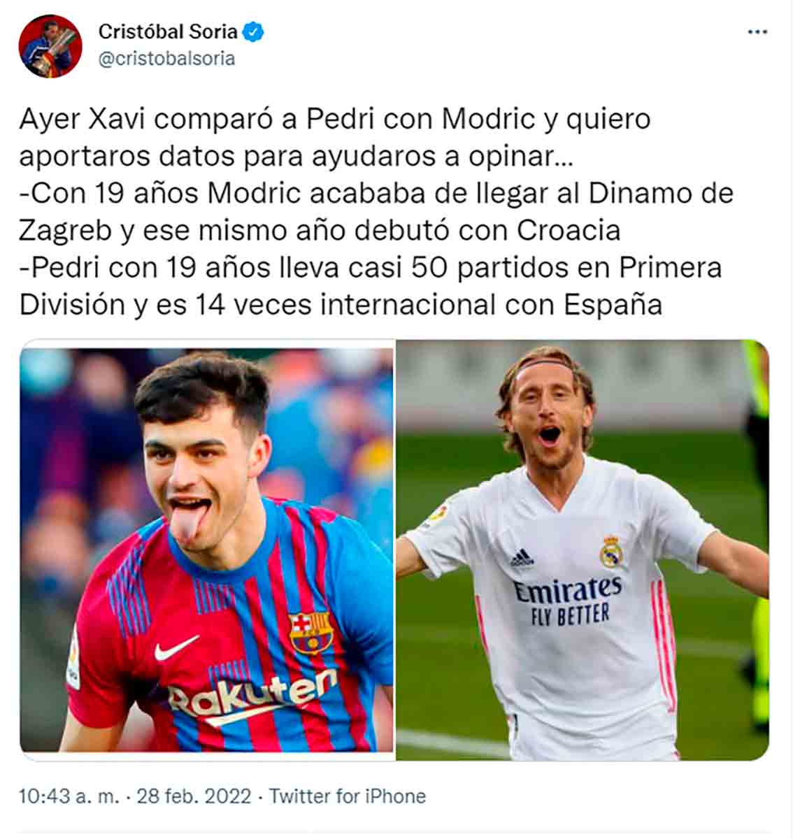 Lo que no sabemos es si en esta comparación, además de las razones futbolísticas que deberían mover al sonrojo a quienes equiparan a Pedri con Modric, también habrán tenido en cuenta hechos como que Modric creciese en mitad de una guerra y nunca se haya quejado por ello mientras Pedri no pierde ocasión de recordarnos lo mal que lo pasó a causa del frío cuando hizo su prueba para jugar en el Real Madrid. Comparaciones surrealistas. El mundo al revés.