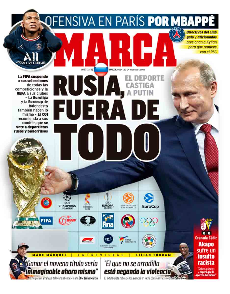 “Rusia fuera de todo. El deporte castiga a Putin”. Si consideramos “El Deporte” como un ente (pese a lo heterogéneo del mismo), son medidas acertadas. Las competiciones deportivas cumplen una función propagandística y económica que nunca está de más mermar al enemigo.