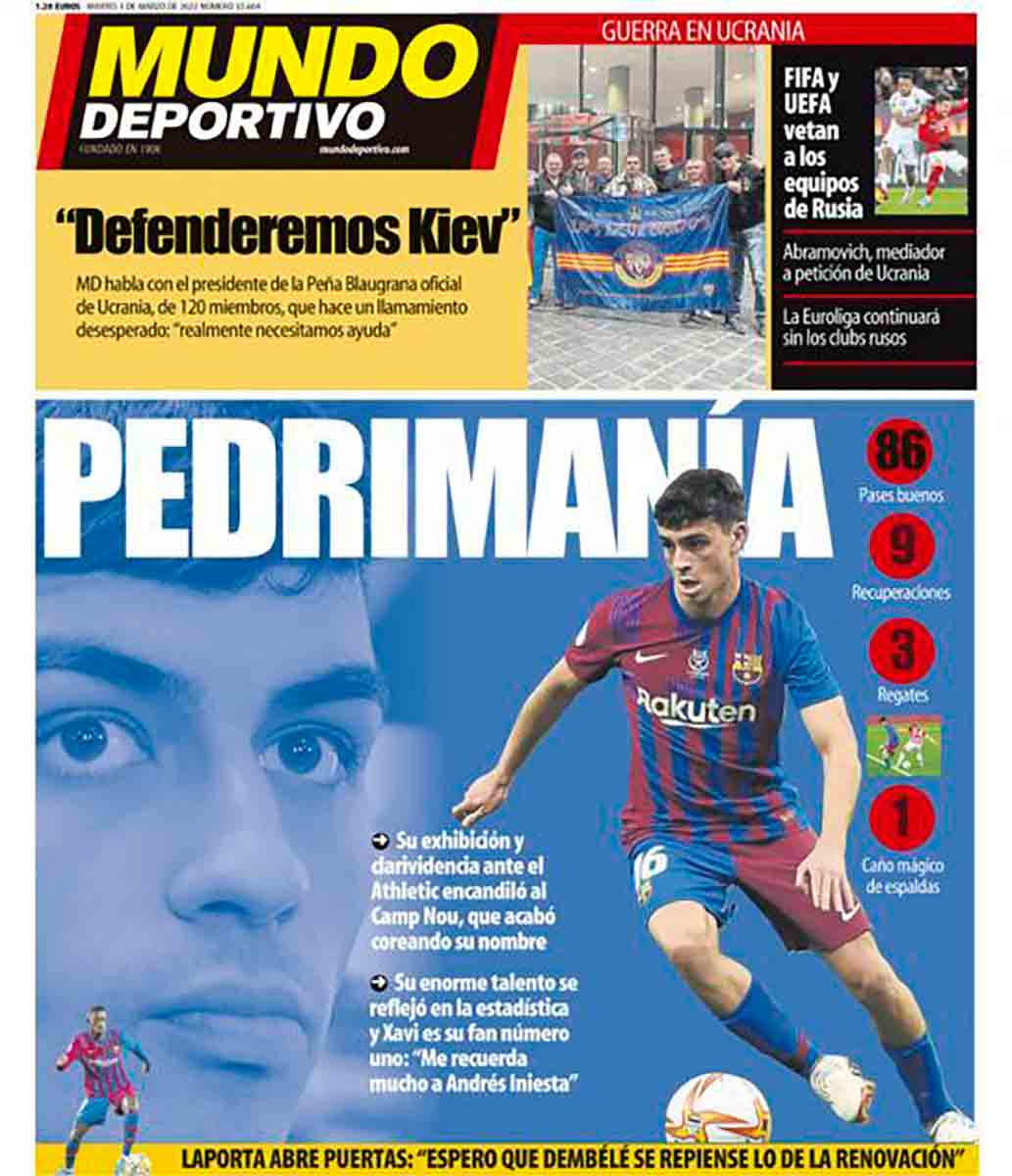 "Pedrimanía", precisamente eso es lo que van a lograr, que cojamos manía al chico. Enésima primera plana laudatoria en honor a Pedri. En el Portanálisis de ayer hablamos de la pseudoencuesta que proponía El Chiringuito en Twitter para elegir entre Pedri o Zidane. Si el bueno de Zinedine no fuese tan humilde, lo imaginaríamos leyendo semejante disparate y después mirando su Copa del Mundo, su Eurocopa, sus múltiples Champions como jugador, entrenador (y hasta segundo entrenador), entre otros logros, para concluir pensando: el mundo al revés.