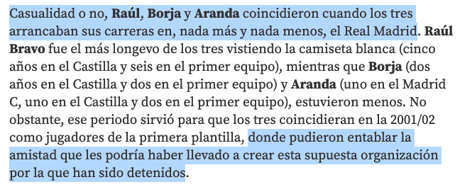 Contrasta el amarillismo utilizado en el cuerpo de la noticia con la cobardía de no firmarla. En cualquier caso el tratamiento resulta bochorno, de mal gusto y de una flagrante falta de dignidad profesional y nos atrevemos a plantear si hasta también humana. "Casualidad o no", escupen, como si estuvieran dejando caer un mazo en busca del mayor eco posible, insinuando que la circunstancia de que tres de los veintipico implicados se criaran en la cantera blanca bien pudiera ser el motivo que explicara los hechos delictivos que ahora se habían convertido en noticia. "Donde pudieron entablar la amistad que les podría haber llevado a crear esta supuesta organización".  De atrás para adelante, traducimos: organización criminal, nacida de las malas compañias favorecidas por el lugar donde se dieron. Querían clavar el nombre del Real Madrid y lo lograron. De la forma más ruin posible, pero lo lograron.