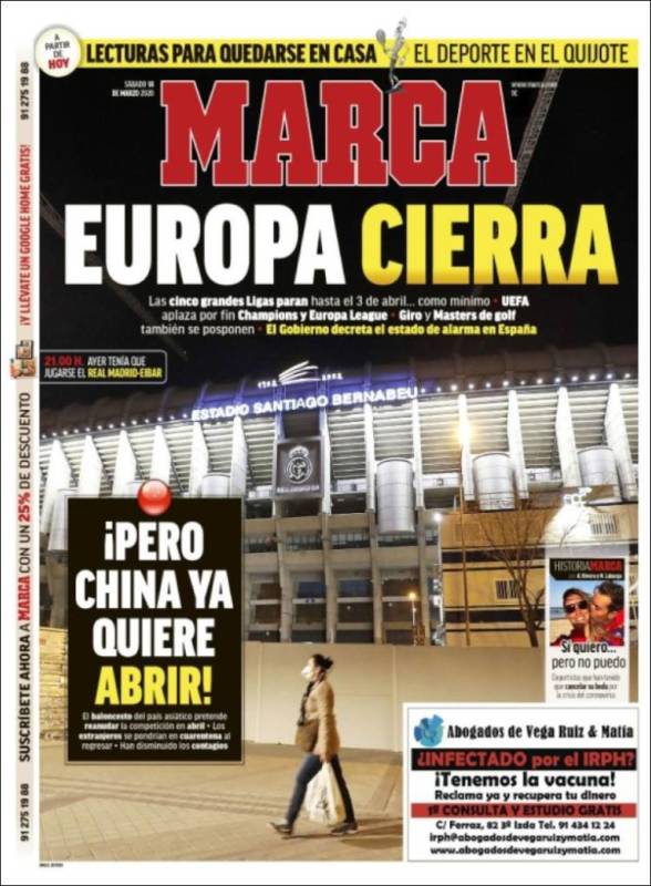 Marca añade un detalle para la esperanza: todo cierra, sí, pero China, donde todo empezó, ya piensa en abrir. Ese apunte en la portada de Marca es la luz al final del túnel. Sí China ya piensa en abrir, nosotros veremos el día en que pensemos en abrir también, y será cuestión de semanas más que de meses. Pero atención: los plazos pueden ser otros, desesperadamente más largos, si no hacemos las cosas bien. Nada debe abrirse hasta que no hayamos achatado esa maldita curva del contagio, hasta garantizar que cada persona que lo precise pueda ser atendida por las complicaciones derivadas de este virus que es potencialmente letal para las capas de mayor edad y/o con problemas de salud previos. Esta es una cuestión de vida o muerte para los menos fuertes. Protejámolos. El confinamiento que hemos de sufrir a partir de ahora es un sacrifico mínimo puesto al lado de la tarea impagable de salvar vidas.