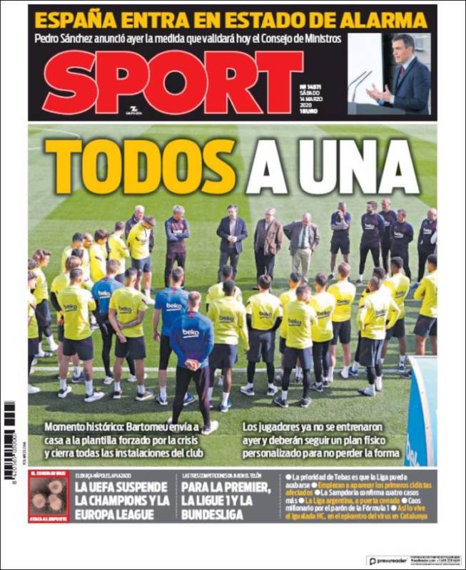 As descerraja (nunca mejor dicho) otra portada muy potente en lo visual. En una especie de graffiti post-nuclear sobre el cierre de una tienda figurada, se nos enumeran algunas de las competiciones que ya han chapado a nivel mundial. El deporte entra en barbecho, empujado por la crudeza desatada de los acontecimientos. Aunque no haya deporte, con todo, se puede hablar de deporte. Se puede hablar de fútbol. Se puede hablar de madridismo. Nosotros, como ya indicaba en su vídeo de ayer Jesús Bengoechea, lo seguiremos haciendo. Esta será vuestra casa, vuestra segunda casa. De esta segunda sí que podréis entrar y salir cuando queráis. De la primera, ni se os ocurra salir.