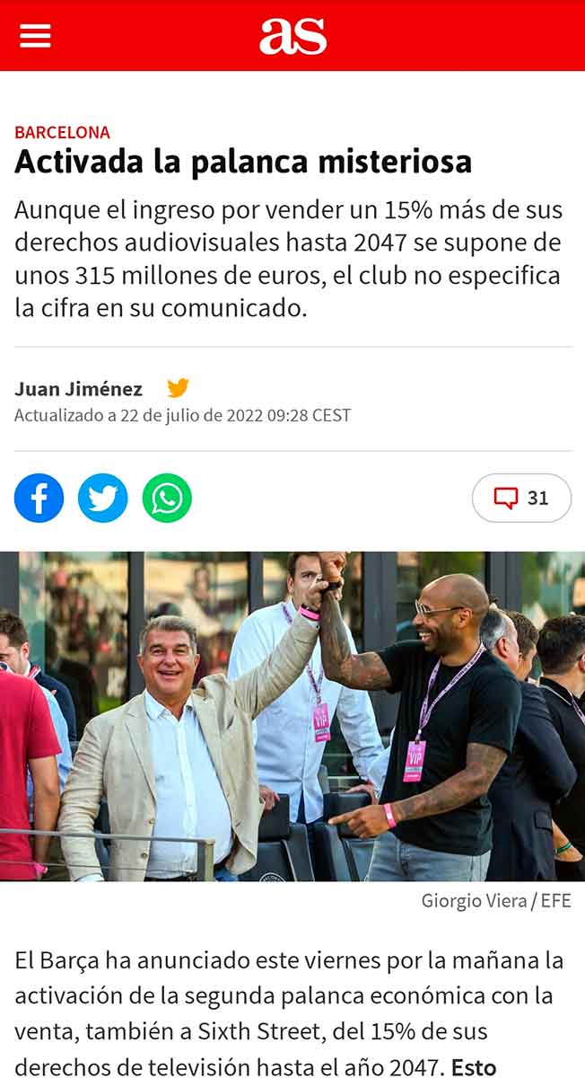 Es decir, el Barça anuncia que activa “la palanca misteriosa” (más bien parece un título de película pseudoerótica de finales de los setenta), pero no especifica las cifras exactas de negocio, a diferencia de lo que sí hizo cuando activó la primera con Sixth Street, con quienes también ha activado esta segunda.